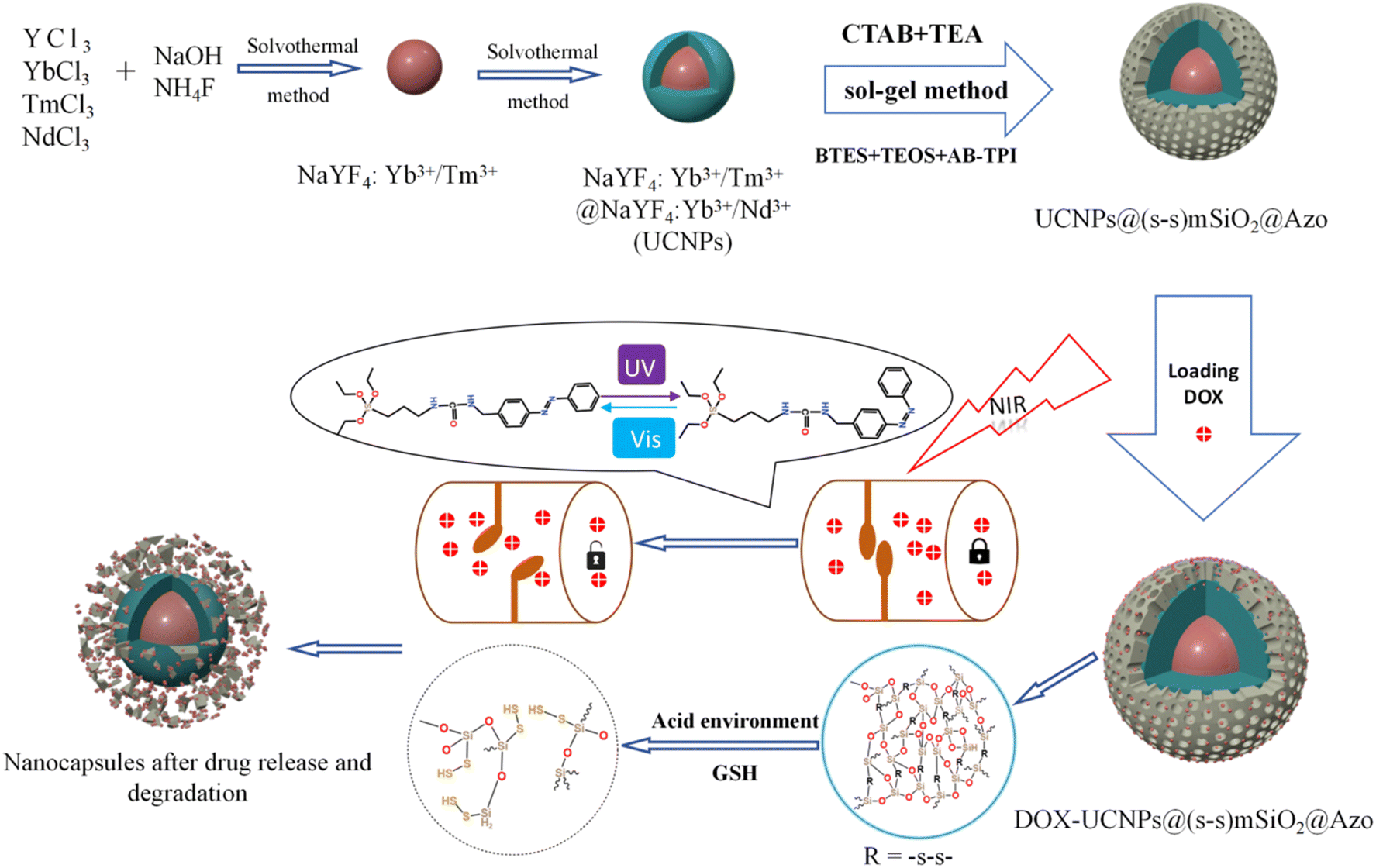 | | Scheme 2 Synthetic route of UCNP@(s-s)mSiO2@Azo nanocapsules and loading and release of DOX on the UCNP@(s-s)mSiO2@Azo nanocapsules. | |