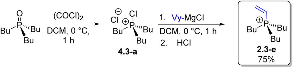 Steps H3 and U4 (Scheme 4) formally complete the Umpolung transformation sequence, leading to all-alkyl P-stereogenic structures 2.4 (Scheme 4, R1–R4 = Alk). Alkaline hydrolysis (H3) of 2.3-a (n-Bu3PhPCl) proceeded in high yield to give n-Bu3PO, which was then subjected to quaternization U4via the corresponding chlorophosphonium intermediate 4.3-a using a vinyl Grignard reagent, affording the trialkylvinyl cation 2.3-e in high yield.