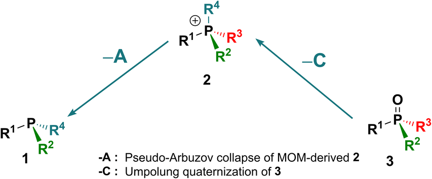 In addition, the key elements of this approach were combined with an unprecedented reverse quaternization of MOM-derived species –A. This process provides an efficient route from MOM-derived tertiary phosphine oxides to chlorinated P(III) compounds. For the first time, a multi-step protection–deprotection strategy was achieved at the nucleophilic phosphorus centre using standard MOM–Cl as the protecting reagent which can be recycled.