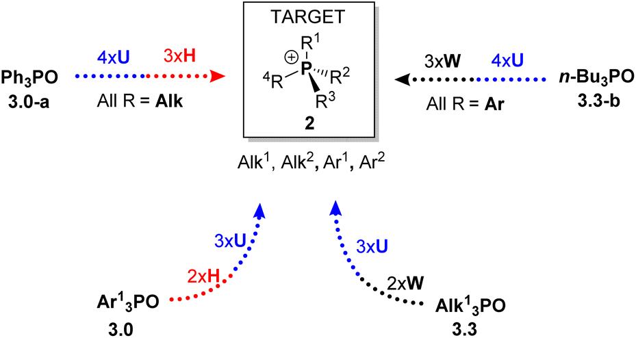 O for phosphine oxides 3) can be synthesized through iterative application of U and H steps. All-alkyl species 2 can be obtained from Ph3PO (3.0-a) via four U and three H steps, while all-aryl structures can be accessed from symmetrical n-Bu3PO (3.3-b) using U and W steps. For mixed structures lacking Ph or n-Bu substituents, the corresponding symmetrical triaryl 3.0 or trialkyl 3.3 derivative can serve as the starting point, following then the same iterative approach.