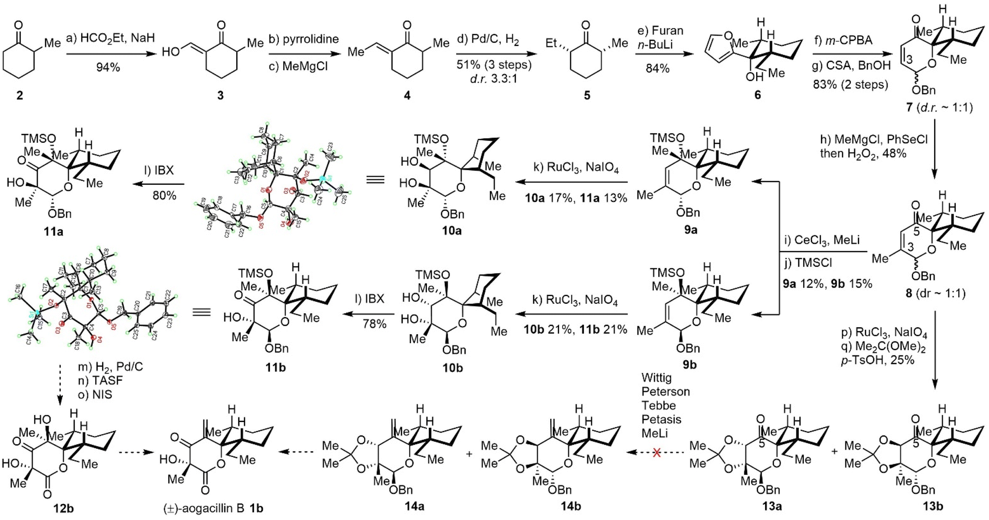 With a reliable supply of spiro-framework 7 in hand, we set out to functionalize the dihydropyranone into the lactone corresponding to aogacillins. Installation of the methyl group at C3 was performed with a methyl Grignard reagent followed by PhSeCl/H2O2 (ref. 16) to afford compound 8 in 48% yield. CeCl3 mediated nucleophilic 1,2-addition17 of MeLi to 8 delivered inseparable products with poor yield. Improvement of the yield was attempted without success due to the extraordinary steric hindrance from the adjacent quaternary carbon (similar to the neopentyl effect). After TMS protection of the tertiary alcohol, the diastereoisomers 9a and 9b could be separated by flash column chromatography on silica gel and used individually in the subsequent reactions. The Upjohn dihydroxylation was found to proceed slowly with low conversion even after 5 days. Fortunately, ruthenium-catalyzed syn-dihydroxylation18 could afford the desired diols 10a and 10b as well as over oxidized hydroxyketones 11a and 11b in moderate yields. The diols 10a/10b could also be oxidized to hydroxyketones using IBX. The structures of 10a (CCDC 2464462) and 11b (CCDC 2464461) were further confirmed by X-ray crystallographic analysis. It is interesting to note that the methyl and ethyl groups on the cyclohexane moiety of 11b are in the equatorial positions based on the X-ray data, while the hydroxyketone 10a places the methyl and ethyl groups in the unfavorable axial positions. With 11a and 11b in hand, we tried to accomplish the total synthesis by transforming the benzyl acetal to lactone as well as dehydrating the C-5 tertiary alcohol to a terminal alkene. However, we encountered unexpected difficulty in dehydration under various conditions and suspected that the adjacent carbonyl might be responsible for the failure of dehydration. We also tried to perform the dihydroxylation from 8 and protection as acetonides 13a/13b. Then olefination was tested using the Wittig reagent, Peterson conditions (TMSCH2MgCl),19 Tebbe reagent,20 and Petasis reagent,21 but unfortunately, none of them could deliver the desired olefin. Methyl addition and dehydration did not work either due to decomposition. This failure forced us to re-design a new synthetic strategy that was not based on the Achmatowicz rearrangement.