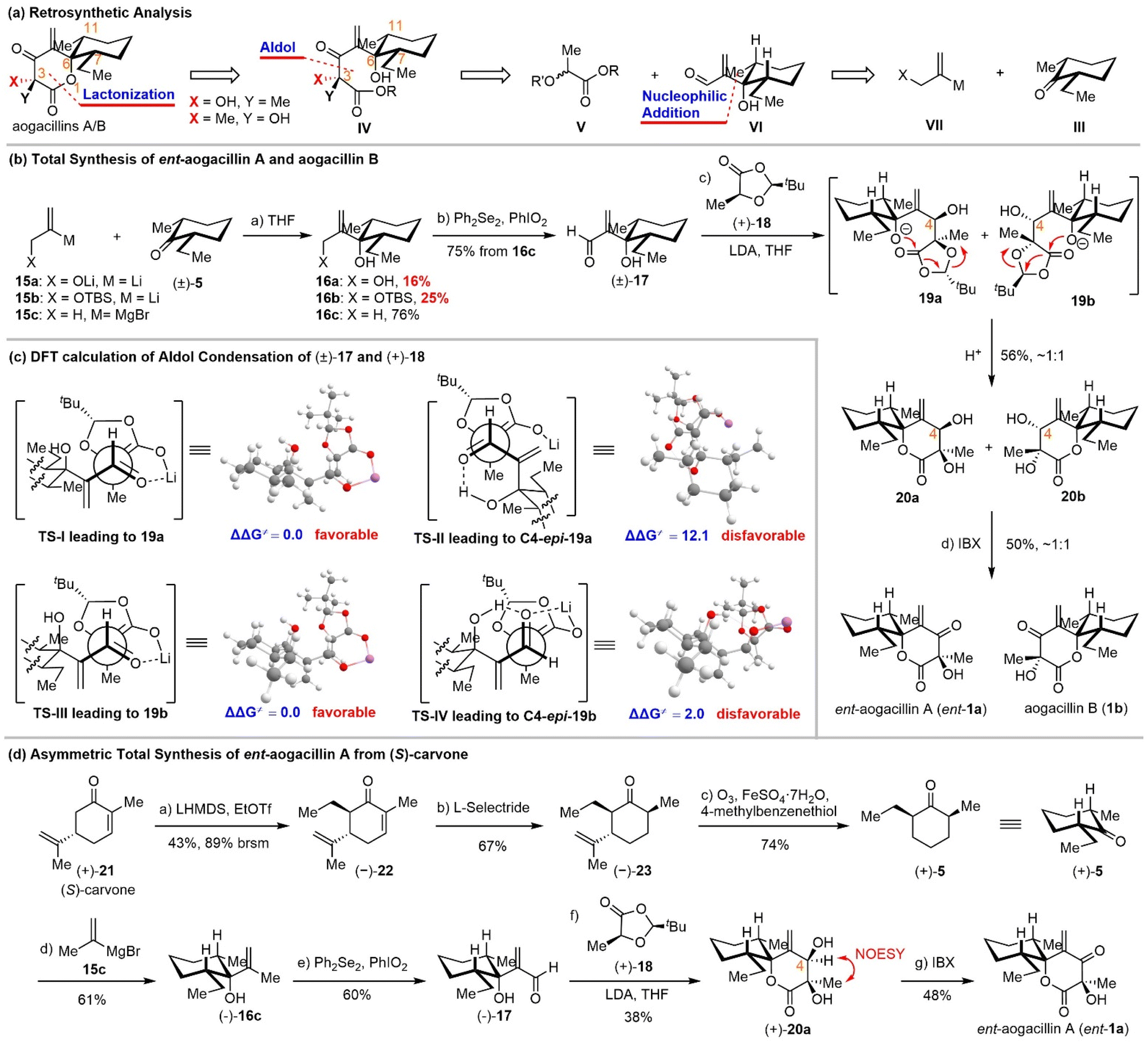 The accomplishment of the first total synthesis of aogacillins warranted some comments. First, the strategic use of Seebach–Fráter chiral 1,3-dioxolan-4-one 18 for the aldol reaction with racemic aldehyde was expected to deliver enantiomerically pure aogacillins if the diastereomeric products 20a/20b could be separated through column chromatography. This idea was achieved finally by chiral HPLC and thus our total synthesis is asymmetric. Second, β-hydroxyl-α-methylene aldehyde (i.e., 17) was employed for the first time in the aldol reaction with 1,3-dioxolanones and the concomitant lactonization, which offers a new venue for the synthesis of functionalized δ-lactones. Third, stereochemical outcomes from the sequential aldol reaction/lactonization are intriguing because only two diastereomers were isolated among eight possible stereoisomers (Scheme 3c). This suggested that the aldol reaction of 17a/b with 18 was highly diastereoselective. Density functional theory (DFT) calculations were performed to predict the configurations of the newly formed C-4 hydroxyl groups. DFT calculations showed that the energy barrier of transition state TS-II leading to C4-epi-19a is higher than that of TS-I leading to 19a; meanwhile, the Gibbs free energy of C4-epi-19a is also higher than that of 19a. This indicates that 19a is favored both kinetically and thermodynamically (see the SI). The energy barrier of transition state TS-IV leading to C4-epi-19b is higher than that of TS-III leading to 19b; however, the Gibbs free energy of C4-epi-19b is lower than that of 19b. (see the SI) This indicates that 19b is favored kinetically and C4-epi-19b is favored thermodynamically. As we conducted the reaction at −78 °C, the kinetically controlled product 19b should be the major product. Besides, it should be noted that this calculated stereochemical outcome is different from those reported by Seebach24 and Battaglia,25 but is consistent with those predicted by Zimmerman–Traxler models, although the β-hydroxyl aldehyde would form intramolecular hydrogen bonds.