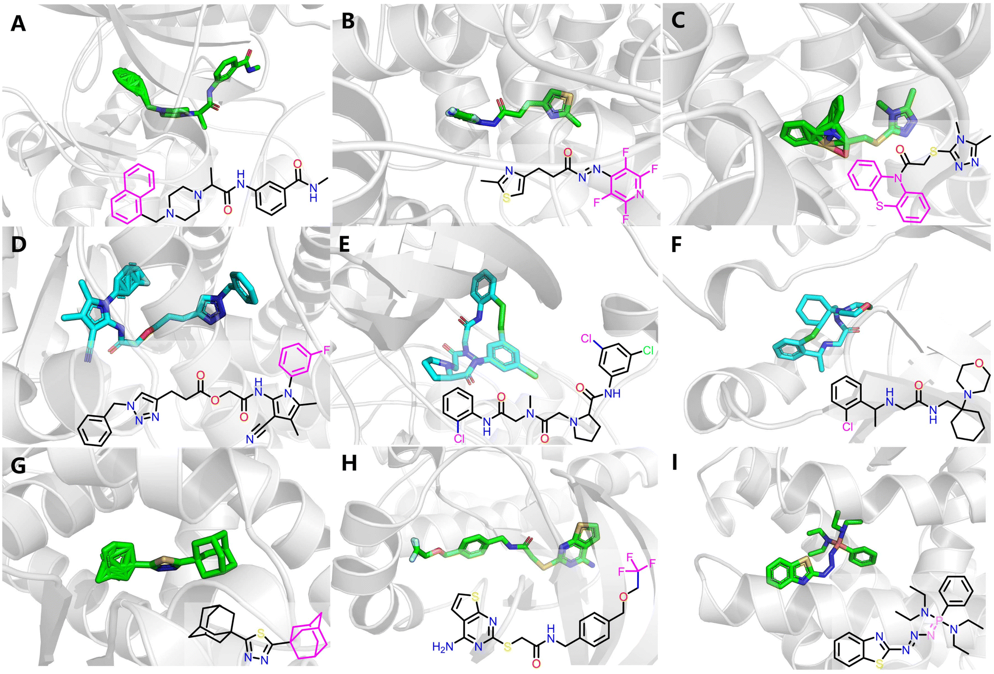 Fig. 10 illustrates some representative structural defects, which primarily arises from the unrealistic predicted atomic distances in certain regions. These include distorted aromatic rings (Fig. 10A–D), spurious macrocycles resulting from unnaturally close halogen interactions in distal rings (Fig. 10E and F), and incorrect placement of uncommon functional groups such as adamantane (Fig. 10G), trifluoromethyl (Fig. 10H) and phosphinimine moieties (Fig. 10I). While some errors could be easily corrected through manual intervention, many remain intractable due to severe structural distortions.