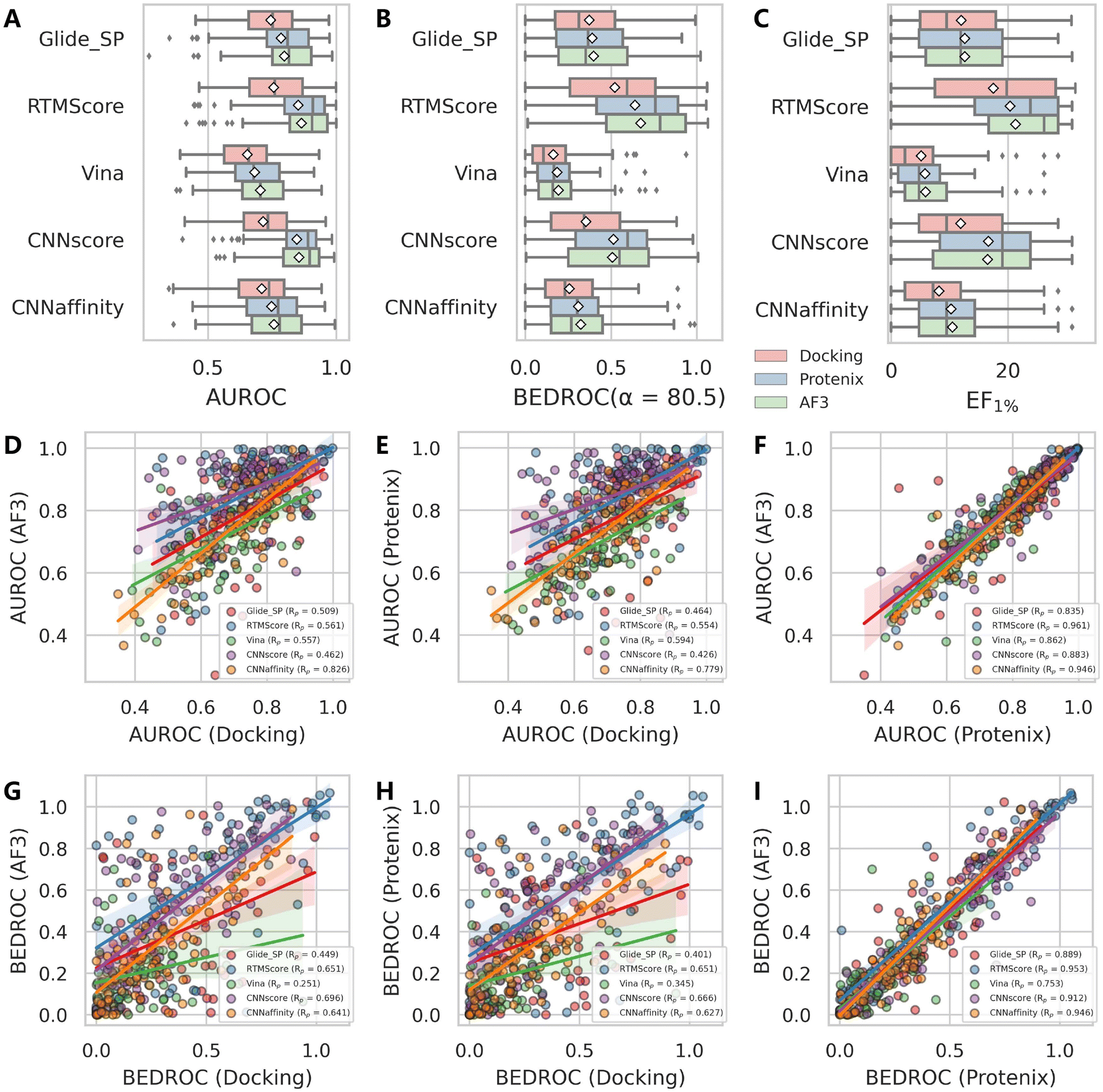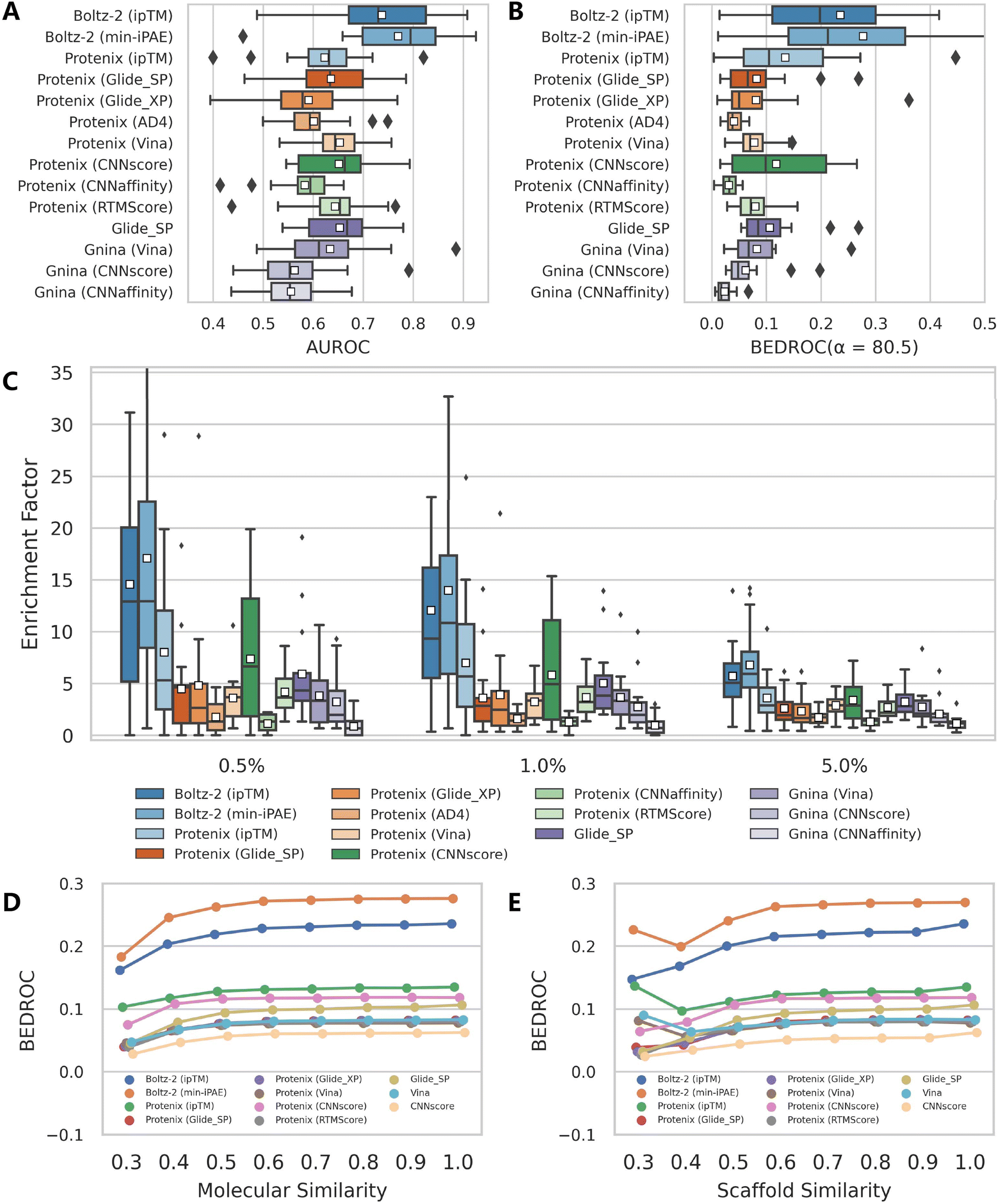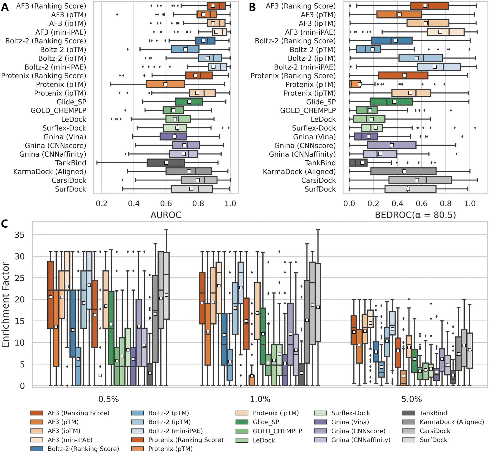 Despite so, Protenix (ipTM) still achieves competitive results, with a mean AUROC of 0.795, BEDROC of 0.507, EF0.5% of 18.44, EF1% of 16.81 and EF5% of 8.84, which not only markedly outperform those of the widely-employed traditional docking programs (the corresponding indicators of the best-performing Glide SP are 0.745, 0.374, 14.20, 12.01 and 6.18), but rival state-of-the-art AI-based approaches like CarsiDock (0.797, 0.561, 20.23, 18.65 and 9.29) and SurfDock (0.758, 0.488, 21.00, 18.17 and 8.34). The performance gap narrows considerably with AF3 (ipTM), which delivers metrics comparable to or even exceeding those of leading AI tools. Another interesting finding is that min-iPAE, a metric first proposed by Omidi et al.37 in AF-Multimer to capture interactions in intrinsically disordered protein regions, demonstrates even better performance than ipTM across all evaluated metrics for both AF3 (e.g., mean BEDROC: 0.755 vs. 0.635; EF1%: 23.15 vs. 19.32) and Boltz-2 (e.g., mean BEDROC: 0.709 vs. 0.560; EF1%: 22.73 vs. 17.96). This finding corroborates previous observations by Shamir et al.,24 highlighting its exceptional potential as an enrichment discriminator. As for the underlying mechanisms, we hypothesize both ipTM and min-iPAE may resemble that of knowledge-based scoring functions to distinguish actives from decoys. Unlike physics-based or empirical scoring functions that explicitly incorporate binding affinity data, these approaches leverage the structural reliability of predicted complexes for compound ranking, which may offer a promising avenue for further enhancing VS performance.