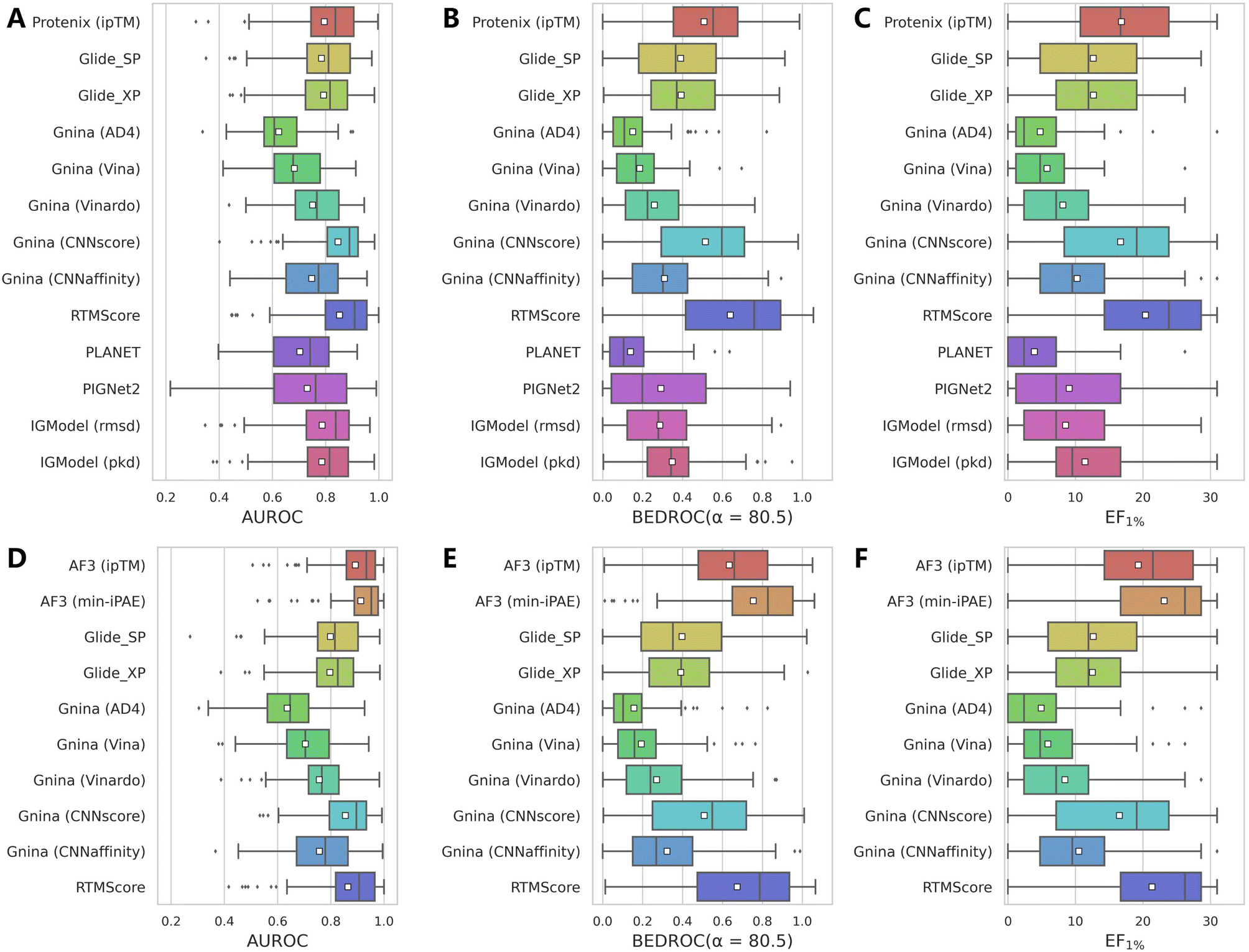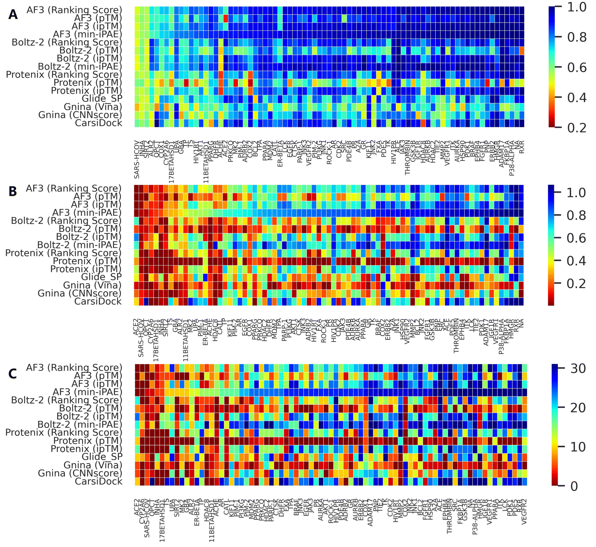 Further analysis of individual target performance (Fig. 2 and S4) reveals that while the four confidence scores embedded in AF3 exhibit nearly identical performance distributions in terms of AUROC, only Ranking score and ipTM show similar trends for other metrics. Interestingly, despite sharing similar prediction principles, Protenix, AF3 and Boltz-2 show divergent optimal targets under identical confidence metrics. This discrepancy becomes even more pronounced when comparing methods with fundamentally distinct screening protocols. Together, these observations emphasize the importance of target-specific evaluation when selecting or optimizing computational methods for a given protein system.