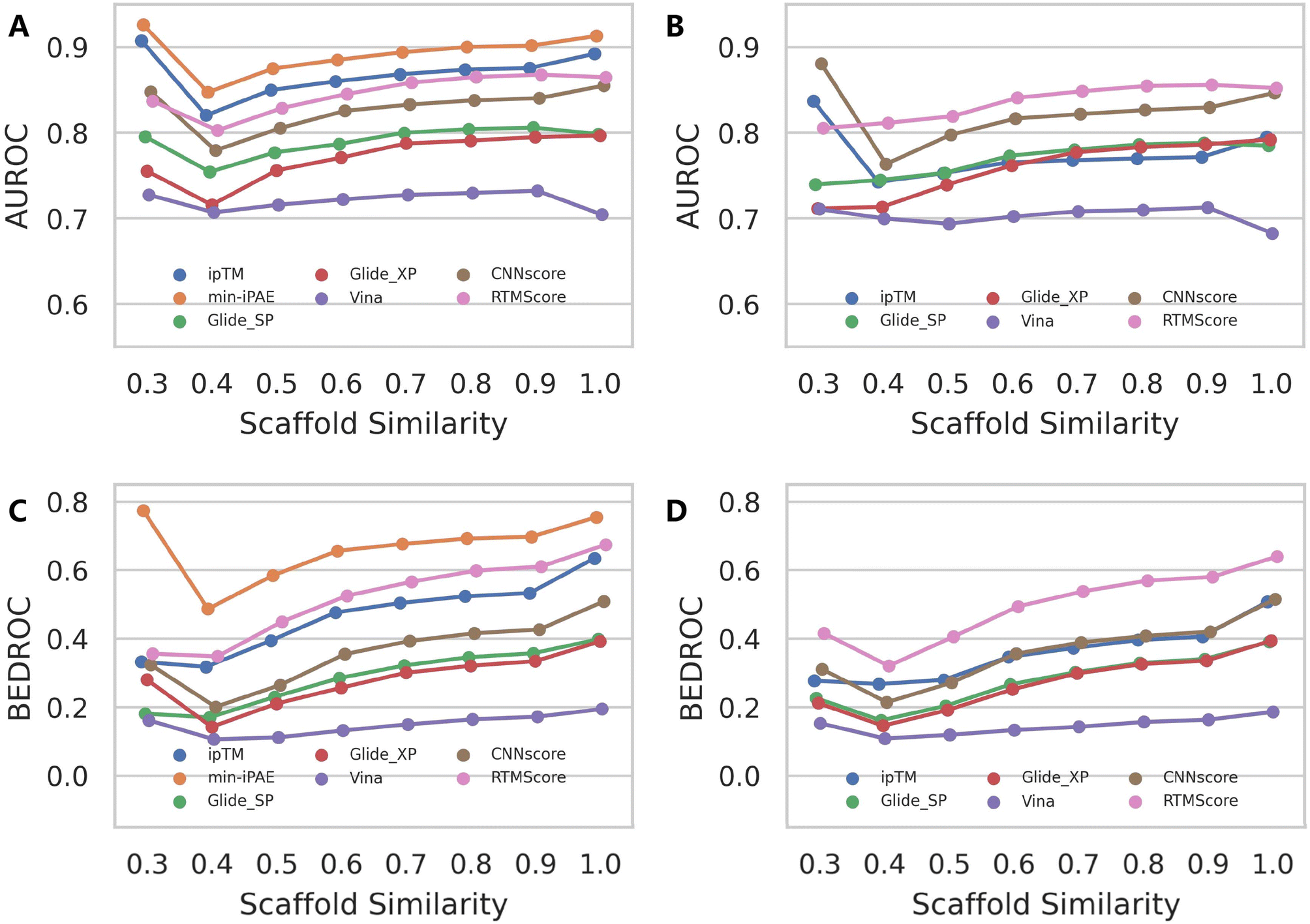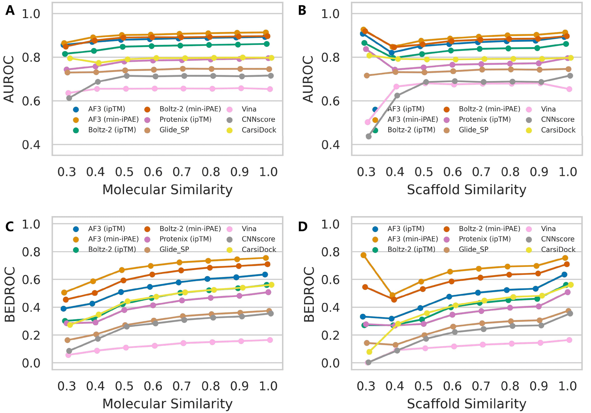 Fig. 5 reveals subtle yet discernible differences in performance trends between mean AUROC and BEDROC metrics. As ligand similarity decreases, AF3-like approaches combined with either ipTM or min-iPAE exhibit a noticeable progressive decline in AUROC scores, while other methods show only marginal variations until the similarity threshold drops below 0.4. Beyond this point, the exclusion of targets with insufficient qualifying active compounds introduces greater variability in the metrics. In contrast, the BEDROC metric presents a more consistent pattern, with all approaches following a similar downward trend. Notably, performance variations based on scaffold similarity are more pronounced than those observed for molecular similarity. These observations indicate that ligand similarity does influence the performance of AF3's intrinsic confidence scores to some degree. Importantly, despite these variations, the relative ranking among screening tools remains stable, with AF3 (min-iPAE) maintaining its superior performance even under low-similarity conditions. These trends were further accentuated in the median AUROC and BEDROC analyses (Fig. S11 and S12).