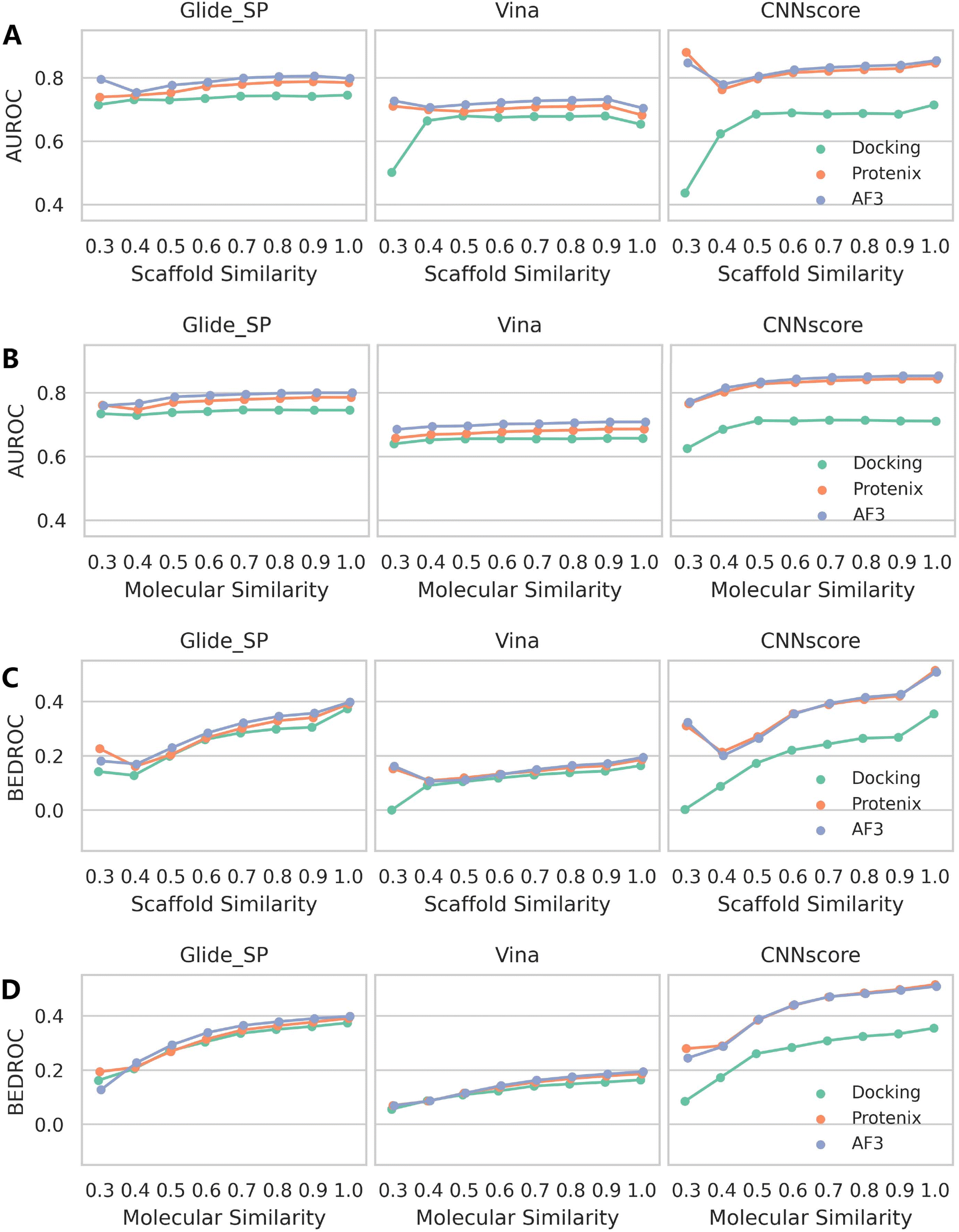 Similar patterns emerge when examining rescoring approaches (Fig. 6 and S13), with one key distinction: almost all methods exhibit a gradual decline in both mean AUROC and BEDROC as similarity decreases. Given that these rescoring schemes rely on structures predicted by either Protenix or AF3, this consistent trend suggests deteriorating pose generation accuracy for complexes featuring novel ligand scaffolds. Nevertheless, as clearly illustrated in Fig. 7, AF3- and Protenix-based pose generators consistently maintain superior performance compared to conventional search-based engines. This advantage is more substantial for deep learning-based CNNscore, whereas classical methods like Glide SP and Vina show progressively smaller performance gaps as similarity thresholds become more stringent.