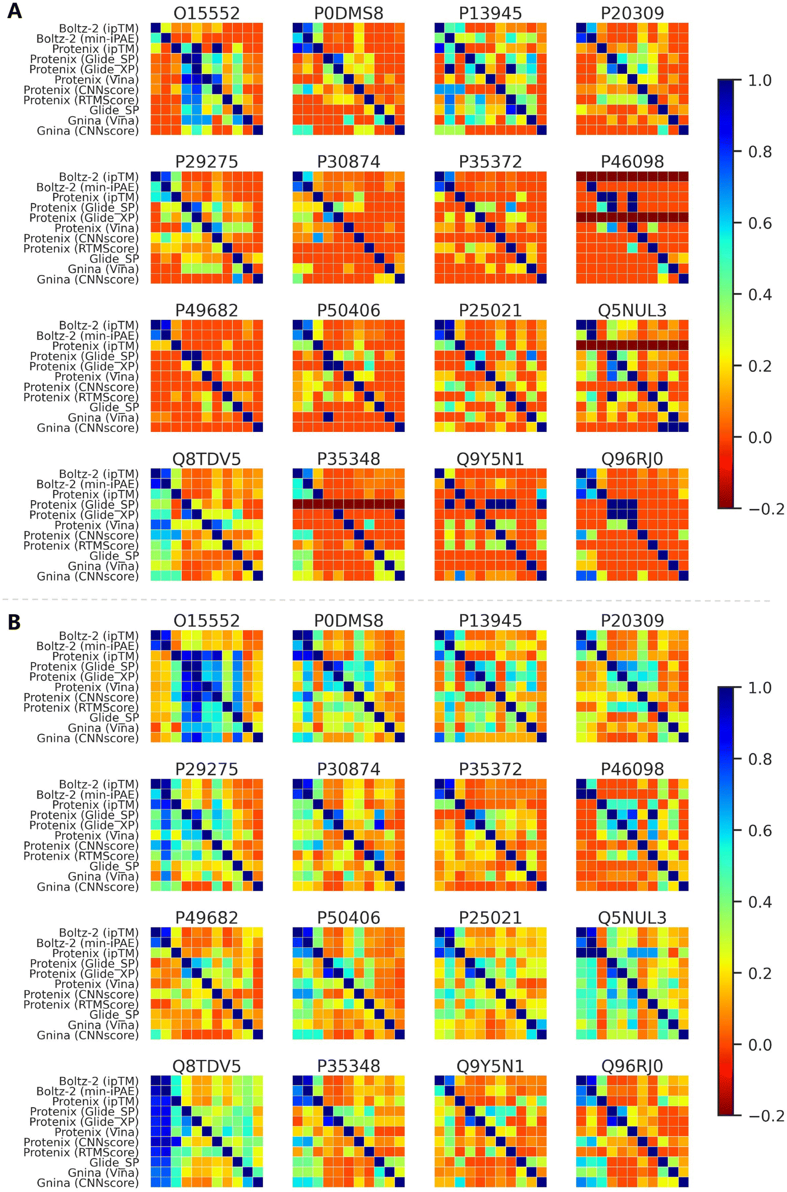 We further analyzed the active compounds enriched in top-100 and top-500 rankings. As shown in Fig. 9, the overlap rates between methods are largely consistent with the ranking correlations. The distinct ranking preferences directly explain the generally low overlap rates observed between most method pairs. Notably, some active compounds in certain targets (e.g., O15552, P13945, Q5NUL3 and Q8TDV5) seem to be easily enriched by almost all the approaches, thus leading to relatively high overlaps across pairs. But for others, the overlaps are more moderate, particularly in the top-100 range. Among all pairs, the actives identified by Boltz-2 (ipTM) and Boltz-2 (min-iPAE) consistently show high overlap, but when paired with other approaches, the metric remarkably decreases. These trends could also be observed in analyses based on average molecular similarities (Fig. S16) and scaffold similarities (Fig. S17).