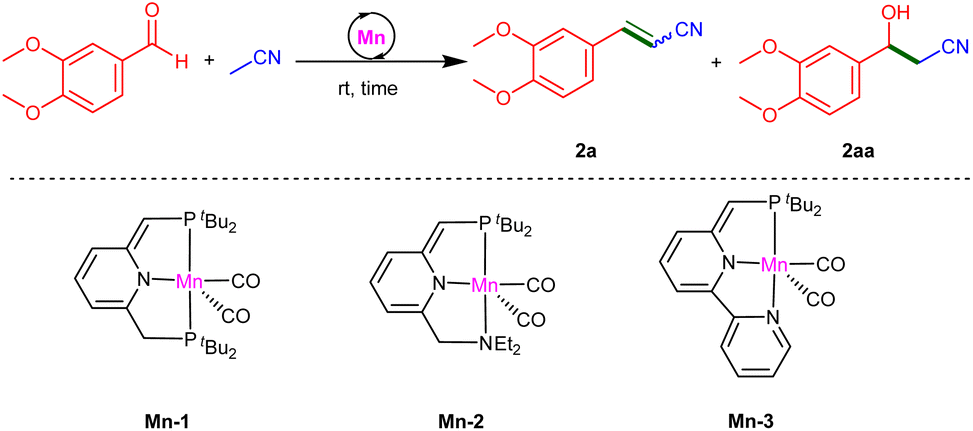1 mixture of CH3CN and THF, aldehyde conversion and the yield of 2a slightly decreased (95% for both; entry 3). Reducing the amount of nitrile even further, to 1 equiv. per aldehyde, afforded poor results (entry 4), thereby indicating that CH3CN must be used in excess for this transformation to be efficient. Complexes Mn-2 and Mn-3 were also found to be catalytically active, but exhibited lower performance than Mn-1 under otherwise identical conditions, with reduced aldehyde conversions (≤65%) and the generation of product mixtures in lower yields (≤53% for 2a, ≤20% for 2aa; entries 5 and 6). Finally, in the absence of these manganese complexes, no product formation was observed at room temperature, even after 48 h (entry 7), clearly demonstrating the role of these complexes as catalysts in this unsaturated nitrile synthesis.