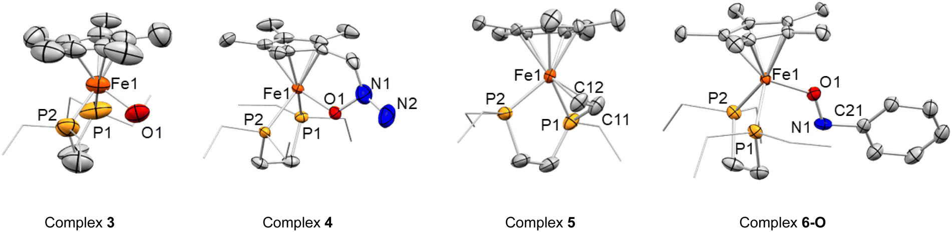 Complex 5 also exhibits a piano-stool conformation, but besides the two phosphorus atoms, the iron center is coordinated to a new vinyl fragment from the formal dehydrogenation of an ethyl arm. This results in a shorter C–C bond distance (1.404(6) Å), as well as short Fe–CH and Fe–CH2 bond lengths of 2.0566(4) and 2.097(4) Å, respectively. Other angles and distances follow similar patterns and orders compared to those found in 1 and 2. Once more, among the plausible scenarios that would in principle fit with the hydrogen-free model obtained from X-ray diffraction studies for compound 5, DFT calculations supported the aforesaid formulation. In particular, the computed Fe(II)–CH and Fe(II)–CH2 distances of 2.059 Å and 2.101 Å concur quite well with those derived from X-ray diffraction (2.057 and 2.097 Å, respectively).