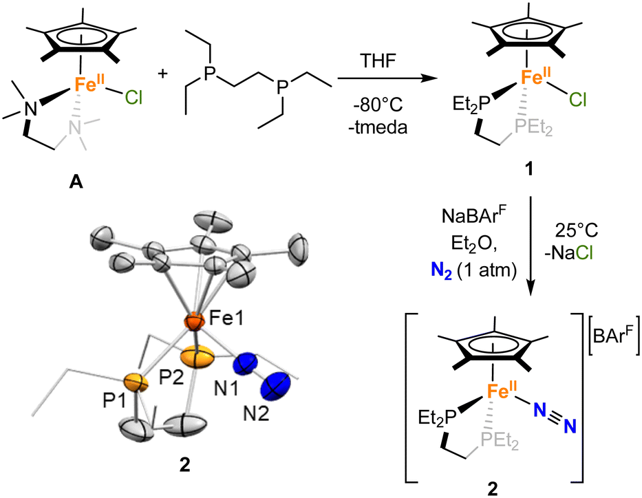 To activate N2O, a vacant site at the metal centre would be required. To achieve this, and as reported for previous Fe(II) half sandwich complexes,39,41,42 removal of the chloride anion from 1 under a dinitrogen atmosphere resulted in the formation of the terminal end-on N2-complex 2, [FeII(depe)(Cp*)(N2)][BArF] ([BArF]− = tetrakis(3,5-bis(trifluoromethyl)phenyl)borate). More precisely, the addition of NaBArF to a violet-purple solution 1 in Et2O under N2 resulted in an orange suspension over the course of 3 h (Scheme 1). Upon filtration, the orange solution was stored at −35 °C, affording orange crystals of 2 over the course of 2 days in 92% yield. The formation of 2 was inferred from a slightly down-shifted 31P{1H} NMR resonance at 79.3 ppm (c.f. 83.8 for 1). Besides, the solid-state IR spectrum of 2 shows a νNN band at 2106 cm−1 (Fig. S75), which compares well with the literature values for analogous half-sandwich complexes of Fe(II) (2098–2117 cm−1),34,38,41 suggesting a low degree of activation of the N–N bond.