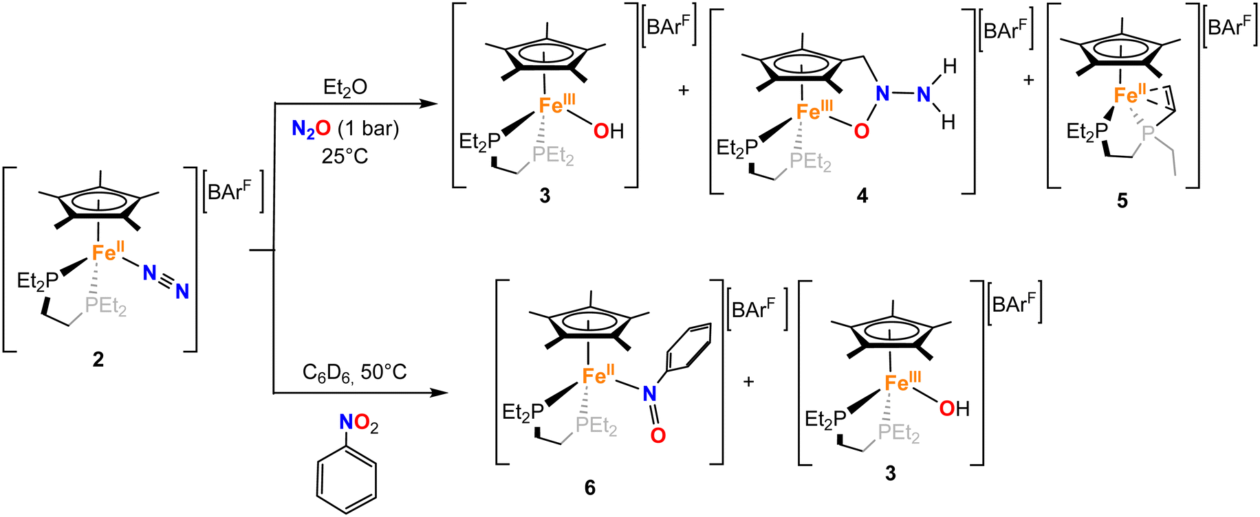 There is an increasing interest in developing catalysts for transforming nitrous oxide (N2O), though systems based on Earth-abundant metals are limited. We report the synthesis of [FeII(depe)(Cp*)N2][BArF] (2; depe = 1,2-bis(diethylphosphino)-ethane; Cp* = η5-C5Me5) and its intriguing reactivity with N2O, which involves a complex manifold of competing routes. This includes an exotic metal–ligand cooperation pathway towards a Cp*-tethered hydrazinyl oxide (−O–N(R)–N(H)2) moiety competing with a metal–metal cooperation route to form a transient FeIV-oxo species. The latter leads to [FeIII(depe)(Cp*)(OH)][BArF] (3) and a product with a dehydrogenated phosphine arm (5). Precursor 2 also reacts with nitrobenzene, allowing the identification of a unique nitrosobenzene complex, [FeII(depe)(Cp*)(κ1N–C6H5NO)][BArF] (6-N), via bimetallic cooperation. The proposed mechanisms are supported by experimental methods and DFT calculations. Furthermore, 2 is an efficient catalyst for the O-transfer reaction from N2O to HBpin (pinacolborane), as well as for the reduction of nitrobenzene, where it exhibits superior performance to current homogeneous catalysts.
