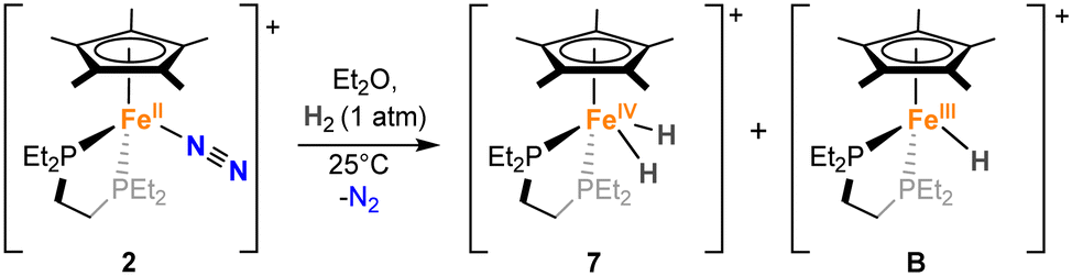 | Scheme 3 Reaction of 2 with H2 to access iron–hydride complexes [FeIV(depe)(Cp*)(H)2][BArF] (7) and [FeIII(depe)(Cp*)(H)][BArF] (B) (the BArF anion has been omitted in the scheme for clarity). | ||