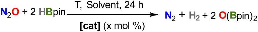 We then decreased catalyst loading to 0.5 mol%, reaching moderate to good yields at variable temperatures, with a maximum of 85% with mild heating at 50 °C (Table 1, entry 6; TON = 171). However, a further increase in the temperature results in lower yields (entry 7), which we attribute to both the lower solubility of the gases and the possibility of catalyst decomposition. The same effect was observed for temperature screening in THF and toluene solvents (see Table S1). Alternatively, using B2pin2 as the reducing agent did not yield any conversion to O(Bpin)2 under our optimized conditions and using 2 as a precatalyst.