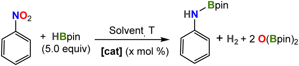We also investigated the catalytic reduction of nitrobenzene by HBpin, which has been reported only recently for two Fe complexes.25,57 In a prototype experiment, a J-Young NMR tube was charged with precatalyst 2, HBpin (5 equiv.) and solvent (0.5 mL), and the reactants were mixed thoroughly. To this mixture, nitrobenzene was added and the reaction was monitored by multinuclear NMR spectroscopy. The reaction proceeds smoothly in Et2O even at room temperature to produce the corresponding N-borylated amine, reaching completion in 30 hours when using 5 mol% catalyst loading (Table 2, entry 2).