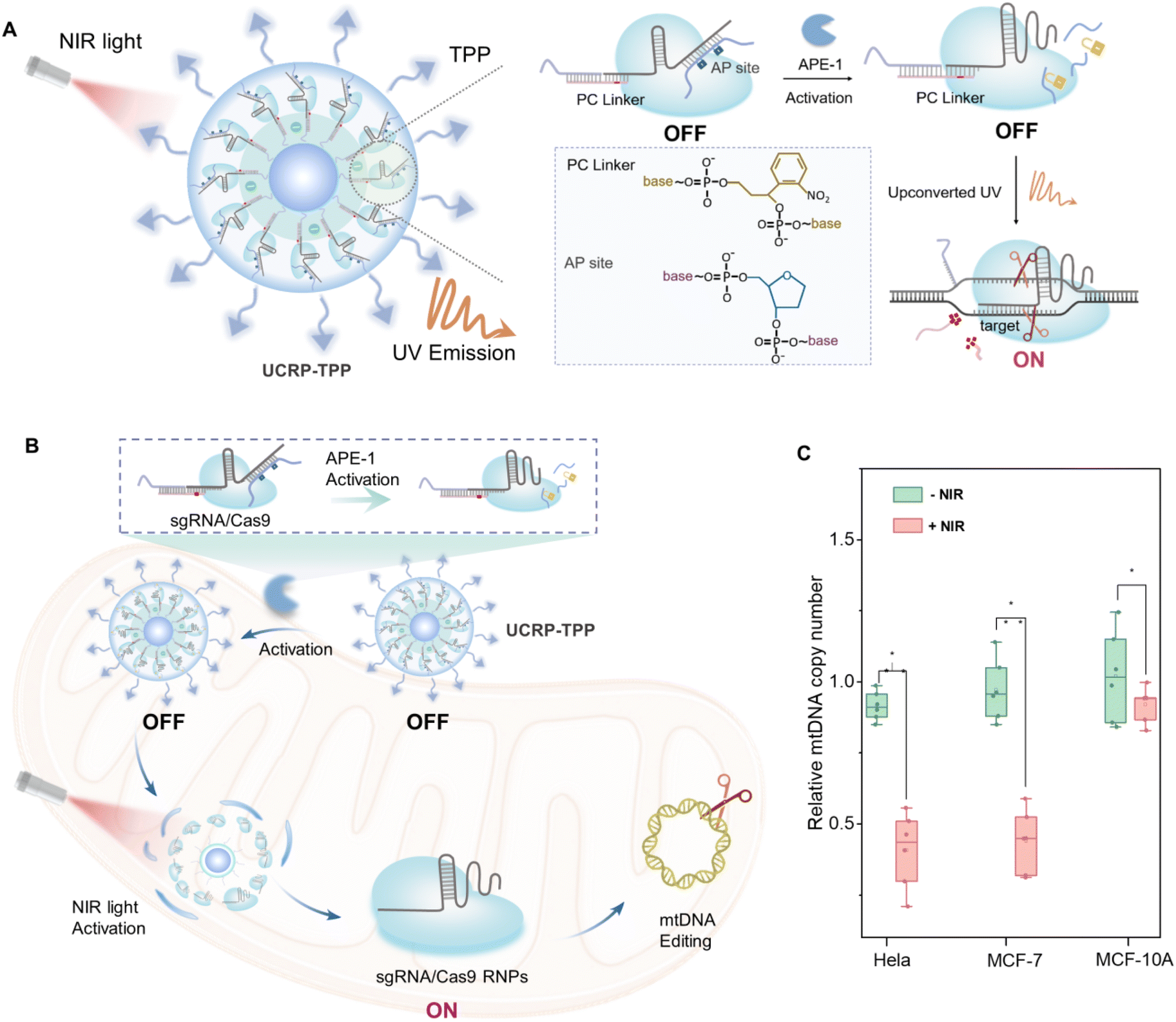 We developed a dual-responsive CRISPR/Cas9 delivery platform (UCRP-TPP) that enables precise mitochondrial gene editing for tumor therapy. By integrating endogenous APE-1 enzyme responsiveness and exogenous NIR light control, the system achieves spatiotemporal activation of CRISPR/Cas9 in tumor cells. The nanoplatform ensures efficient intracellular transport, mitochondrial localization, and minimizes off-target effects. Upon APE-1 and NIR light activation, UCRP-TPP induces mtDNA editing by CRISPR/Cas9, disrupts mitochondrial membrane potential, and triggers ROS generation and apoptosis, resulting in selective killing of cancer cells in vitro and in vivo. This strategy provides a powerful tool for stimulus-responsive gene-editing systems in cancer therapeutics.