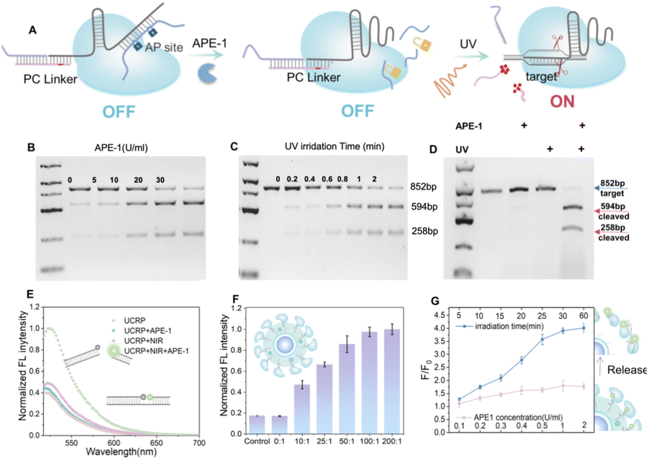 | | Fig. 3 UV light- and APE-1-triggered activation of the CRISPR/Cas9 system. (A) Schematic illustration of the activation of sgRNA/Cas9 via APE1-mediated strand cleavage and UV-induced photolysis. (B–D) Gel electrophoresis analysis of Cas9/sgRNA-mediated cleavage of 852 bp mtDNA upon (B) APE1 interaction, (C) UV light irradiation, respectively and (D) the simultaneous interaction with APE1 and UV light stimulation. Fragments of 594 bp and 258 bp were detected. (E) Fluorescence intensity of FAM-BHQ1-labeled target DNA after treatment with UCRP under different conditions (±APE1, ±NIR). (F) Optimizing the activity of UCRP by varying the molar ratio of Cas9/UCNP. (G) Fluorescence intensity ratios of released FAM-labeled sgRNA in the supernatant as a function of APE1 concentration and NIR irradiation time. F represents the fluorescence intensity of FAM-labeled sgRNA released into the supernatant after treatment with APE1 and NIR irradiation, while F0 refers to the fluorescence intensity of FAM-labeled sgRNA in the supernatant under initial conditions (without APE1 exposure or NIR irradiation). n = 3; data are presented as mean ± SD. | |