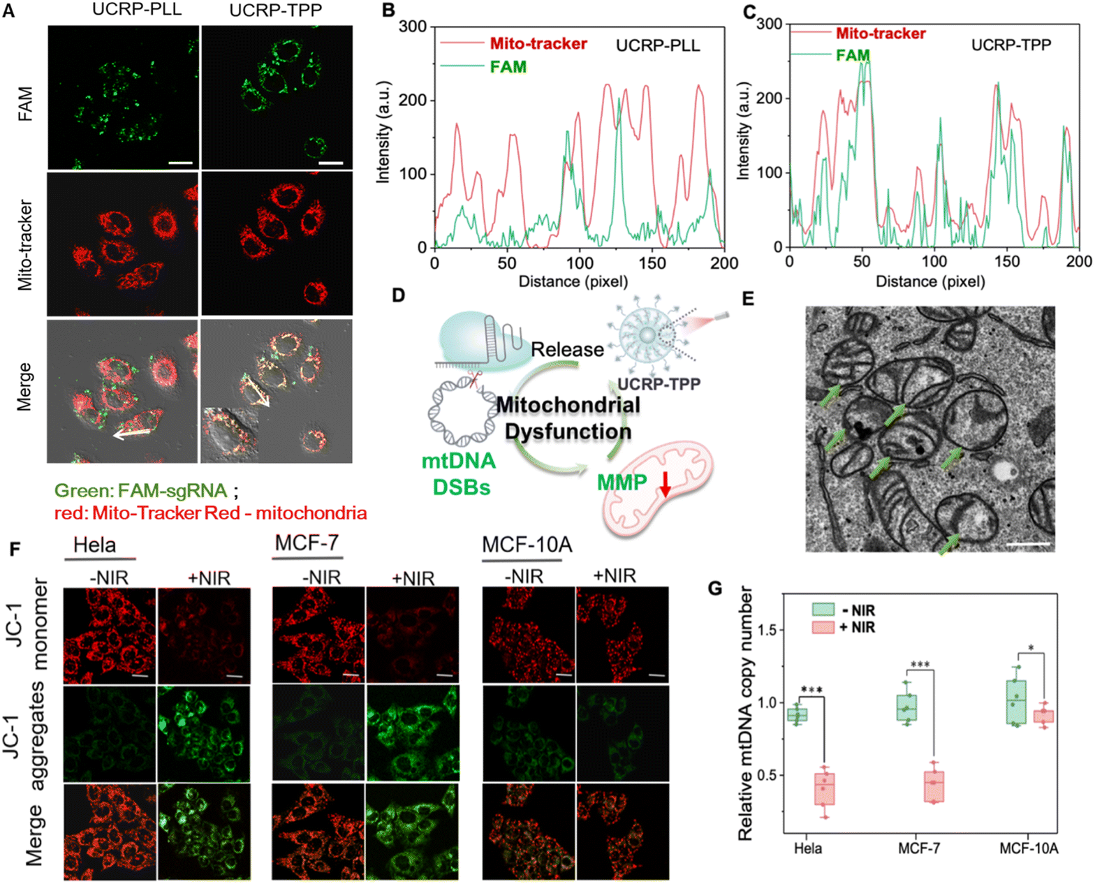 | | Fig. 4 Mitochondrial dysfunction induced by APE-1 and NIR light-triggered UCRP-TPP. (A) CLSM images of HeLa cells treated with UCRP-PLL and UCRP-TPP (FAM-labeled sgRNA), colocalized with MitoTracker (red); scale bar: 20 µm. (B and C) Fluorescence intensity profiles of MitoTracker with (B) UCRP-PLL and (C) UCRP-TPP along the white arrow in (A). (D) Schematic illustration of mitochondrial damage induced by UCRP-TPP. (E) Bio-TEM image of mitochondria in MCF-7 cells after treatment with UCRP-TPP under NIR light irradiation; scale bar: 500 nm. (F) CLSM images of JC-1 staining in HeLa, MCF-7, and MCF-10A cells before and after NIR light irradiation (1.2 w cm−2, 30 min, 980 nm); scale bar: 20 µm. (G) Quantification of mtDNA copy number in HeLa, MCF-7, and MCF-10A cells by qPCR. *P < 0.1, ***P < 0.001. Data represent mean ± SD (n = 3). | |