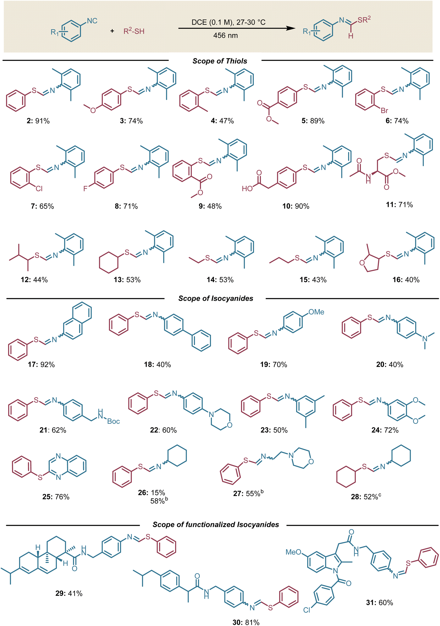 The in situ formation of diphenyl disulfide can be explained by the tendency of thiols to self-oxidize in the presence of residual oxygen in the solvent (see SI, Section 4.8). As the only absorbing species in the reaction mixture would have been the diphenyl disulfide, we increased its concentration in an attempt to prove our assumption and promote the reactivity. As expected, we obtained a higher yield at 1 M reaction concentration compared to the reaction with 0.1 M concentration. Similarly, with cyclohexyl isocyanide and cyclohexyl thiol, we employed a catalytic amount of diphenyl disulfide to start the radical chain reaction to deliver the desired product (Scheme 2, 28). It is important to note that we did not observe any 1,1-bisthiolation side product in any case. To further probe the functional group compatibility, we employed isocyanides functionalized with complex molecular scaffolds such as the benzoamide derivatives of the drugs abietic acid, ibuprofen, and indomethacine that gave the desired products in moderate to good yields (29, 30, and 31, respectively, Scheme 2).