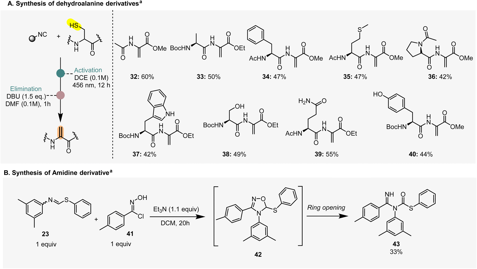 | Scheme 3 Application of thioformimidates to the synthesis of dehydroalanine and amidine derivatives. aYields refer to a two-step process. | ||