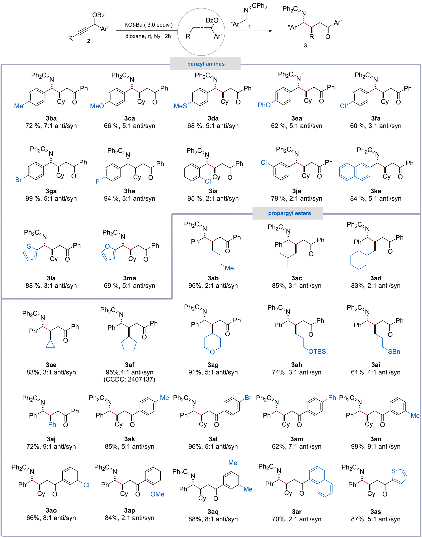 | a Unless otherwise specified, the reactions were performed at rt in dioxane under nitrogen for 2 h with 1 (0.2 mmol), propargyl ester 2 (0.4 mmol) and KOt-Bu (0.6 mmol); the relative configurations were determined or assigned by analogy on the basis of the X-ray structure of 3af; the diastereoselectivities (anti/syn ratios) were determined by 1H NMR of the crude reaction mixture. |