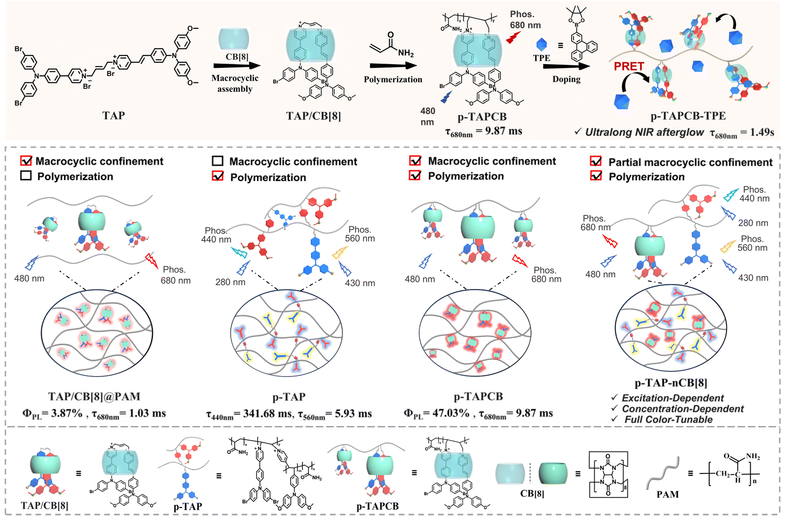 1 complex, driving the oriented polymerization with acrylamide to form a “lantern-like” biaxial ring rotaxane polymer (p-TAPCB). Benefitting from the non-covalent host–guest interactions with CB[8] and the rigid covalent polymeric environment provided by the polymer network, the resultant supramolecular polymer p-TAPCB displayed robust NIR phosphorescence emission at 680 nm with a photoluminescence quantum yield of 47.03%. Crucially, by adjusting the CB[8] ratio during polymerization from 0 to 0.75 equivalent, an excitation-dependent, concentration-dependent, and color-tunable phosphorescence behavior ranging from blue, yellow, and red was achieved. To extend the NIR afterglow, we leveraged PRET by doping with long-lived phosphorescence donor triphenylenylborate (TPE), which prolonged the NIR emission lifetime of the energy acceptor p-TAPCB from 9.87 ms to 1490 ms with a large Stokes shift (390 nm). Significantly, these water-soluble NIR phosphorescence supramolecular copolymers displayed imaging ability to penetrate tissue and served as security inks applied in multilevel information encryption.
