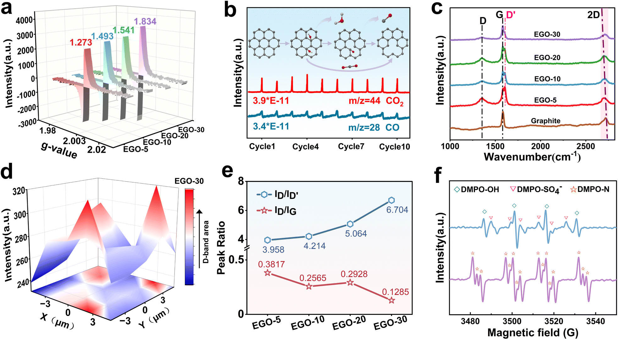 Raman spectroscopy analysis (Fig. 2c) was further performed to characterize the carbon structure of the EGO. The overall ID/IG ratio shows a downward trend, indicating that as the oxidation time was extended, sp3 carbon decreased and SVs increased. Compared to the graphite, the 2D band (2720 cm−1) of the EGO undergoes a red shift, which also suggests the transformation of in-plane sp2 carbon to distorted sp3 carbon and the development of defects.35 In addition to the typical D-band (1350 cm−1) and G band (1580 cm−1) peaks, the characteristic peak for the D′ band was observed at 1611 cm−1 for EGO. The intensity of the D′ band, originating from a double resonance Raman feature induced by disorder and defects, has been reported to be a measure for distinguishing boundary-like defects (ID/ID′ = ∼3.5), vacancy-type defects (ID/ID′ = ∼7), and sp3-type defects (ID/ID′ = ∼13) by comparing with the intensity of the D-band. Herein, the ID/ID′ ratio increased with the oxidation duration from 3.958 (EGO-5) to 6.704 (EGO-30), indicating that the boundary-like defects gradually transformed into vacancy-type defects (Fig. 2e).36 Meanwhile, 3D Raman mapping of the D peak from the EGO-30 within a square area of 10 µm × 10 µm displays uniform distribution of the vacancies on the graphite plane (Fig. 2d).