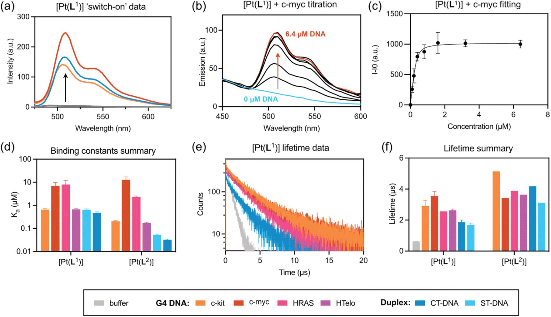 Having established the relative DNA binding affinities for [Pt(L1)] and [Pt(L2)], we then recorded the phosphorescence lifetimes of the two complexes in aqueous buffer with and without DNA. As expected, based on the switch-on properties of these complexes, the phosphorescence lifetime in the absence of DNA is significantly shorter (τw = 0.62 µs) than when bound to any of the DNA structures under study. More interestingly, for complex [Pt(L1)] the phosphorescence lifetimes are consistently longer when bound to G4s (τw = 2.5–3.6 µs), as compared to duplex DNA (τw = 1.5–2.0 µs). In the case of [Pt(L2)], the increase in lifetime is even larger when bound to DNA (highest τw = 5.1 µs for c-kit G4 DNA), but the differences in phosphorescence lifetime between G4s and duplexes are not distinct enough to consistently differentiate between the two topologies.
