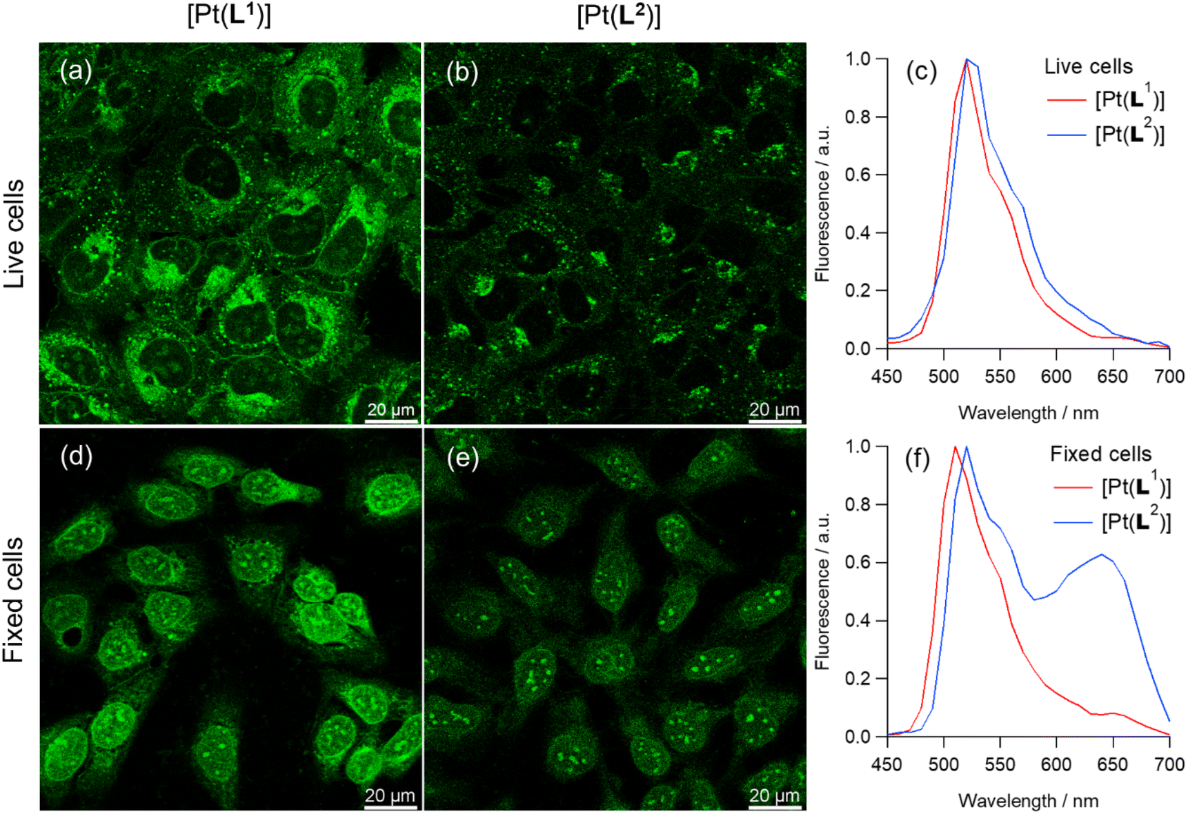 While some red emission centred at 660 nm, assigned to aggregated species, was detected for [Pt(L1)] at longer incubation times in live cells (Fig. S43), green vs. red channel co-localisation imaging experiments clearly demonstrated that the red emission at 660 nm originates exclusively from granule-like structures and shows no overlap with regions displaying the green emission (monomer).