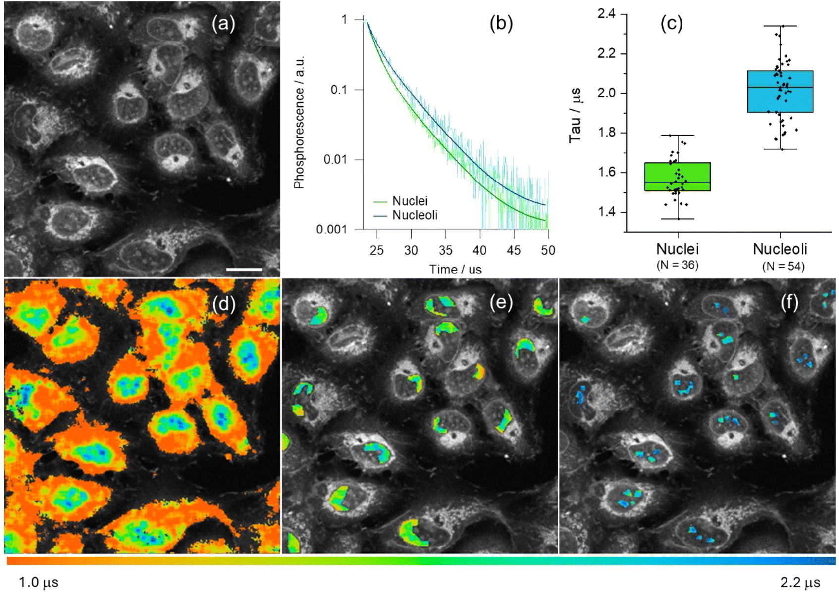 PLIM datasets were recorded for [Pt(L1)] at early stages of incubation in live U2OS cells, at conditions where no aggregation-assigned red emission was seen. [Pt(L1)] showed sufficient signal intensity from nuclei for reliable analysis of phosphorescence lifetimes (Fig. 4). Unsegmented PLIM images of live U2OS cells incubated with [Pt(L1)] (Fig. 4d) demonstrate a clear correlation of lifetime values with different organelles: the shortest lifetimes seen within cytosolic organelles (ca. 1.2 µs), longer lifetimes in nuclei (ca. 1.6 µs) and the longest values seen in nucleoli (ca. 2.1 µs). Significant differences in lifetimes within nuclei were confirmed by segmentation of corresponding areas, with averaged kinetic curves as well as individual region of interest (ROI)-wise value distributions (Fig. 4b, e and 4f, respectively). While the [Pt(L1)] lifetimes within nuclei are of the same magnitude than those recorded for the probe with ct-DNAs in vitro (see Table S6), the longer lifetimes in the nucleoli may indicate a contribution from [Pt(L1)] interacting with G4 quadruplexes, which are known to be present in higher concentrations within nucleoli.44 Likewise, long phosphorescence lifetimes were detected for [Pt(L1)] in fixed cells, Fig. S46. Overall, much brighter signals were detected from fixed cells, with both the nuclear lifetime values (ca. 2.6 µs) and nucleolar lifetimes (ca. 2.75 µs) falling in the ‘quadruplex’ region of lifetimes of [Pt(L1)] (τw = 2.5–3.6 µs, Table S6). It is noteworthy, that signal intensities were higher and lifetimes of [Pt(L1)] were longer in fixed cells compared to live cells, which may indicate higher accessibility of G4s upon cell fixation.