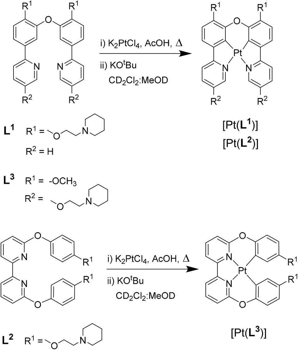 We then proceeded to the coordination of platinum(II) to the three new tetradentate ligands, which involved cyclometallating two of the aromatic rings (Scheme 4). After purifying and isolating [Pt(Ln)] (n = 1, 2, 3), these three new complexes were characterised by 1H, 13C and 195Pt NMR spectroscopies. In particular, the disappearance of the two aromatic protons in the 1H NMR spectra of the complexes, was diagnostic that the reaction had occurred; in addition, we observed the expected shifts of other signals – particularly those closer to the coordinating groups – and the correct integration (see SI for spectroscopic data). The 195Pt NMR spectra of the three purified complexes were also consistent with the formation of cyclometallated platinum(II) complexes, as compared to data previously reported for other tetradentate C^N^N^C and N^C^C^N ligands. The formulation of complexes was further confirmed by mass spectrometry which showed peaks at 772, 832 and 788 a.m.u. for [Pt(L1)], [Pt(L2)] and [Pt(L3)] respectively.