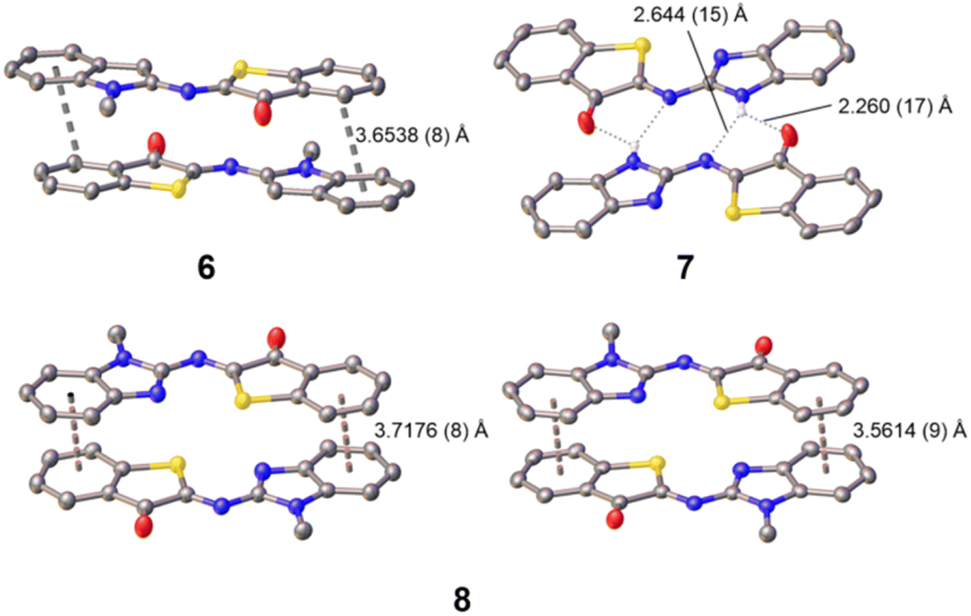 | | Fig. 2 Single-crystal X-ray structures of 6–8 and their intermolecular supramolecular assembly through π-stacking (6 and 8) and H-bonding (7). More details can be found in the SI – Fig. S47–S49 and Tables S5–S7. CCDC: 6 – 2431430, 7 – 2431431; 8 – 2431432). | |