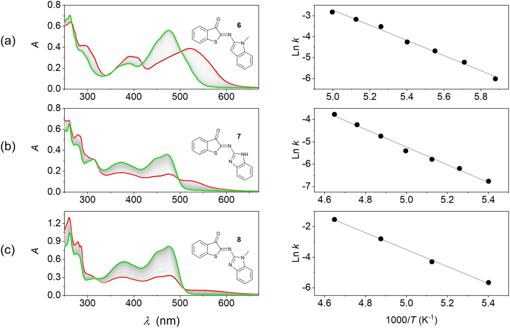 | | Fig. 3 Thermal E → Z isomerization of HA-ITI photoswitches monitored by UV/vis absorption spectroscopy and Arrhenius analysis. (Left) Spectra of the thermal back isomerization of (a) 6 (at 170 K), (b) 7 (at 185 K), and (c) 8 (at 185 K) in MTHF. The green spectra correspond to the fully recovered signatures of the Z forms, while the red spectra correspond to the signature of the photothermal stationary state mixture (generated by irradiation at 375 nm). (Right) Corresponding Arrhenius plots. | |