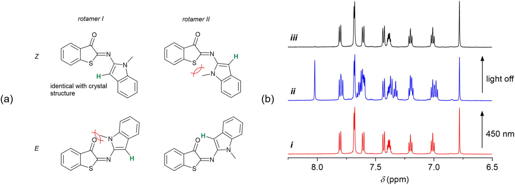 | | Fig. 4 (a) Possible rotamers of the Z and E forms of HA-ITI photoswitch 6. The proton highlighted in green was used as diagnostic tool for rationalizing the formation of the E isomer upon irradiation. (b) Partial 1H NMR spectra of 6 in THF-d8 at 190 K, demonstrating the reversible T-type photoswitching. (i) Z-6 before irradiation, (ii) photothermal stationary state upon irradiation with 450-nm light (Z/E ca. 50/50), (iii) spectrum after thermal back isomerization in the dark, corresponding to Z-6. | |