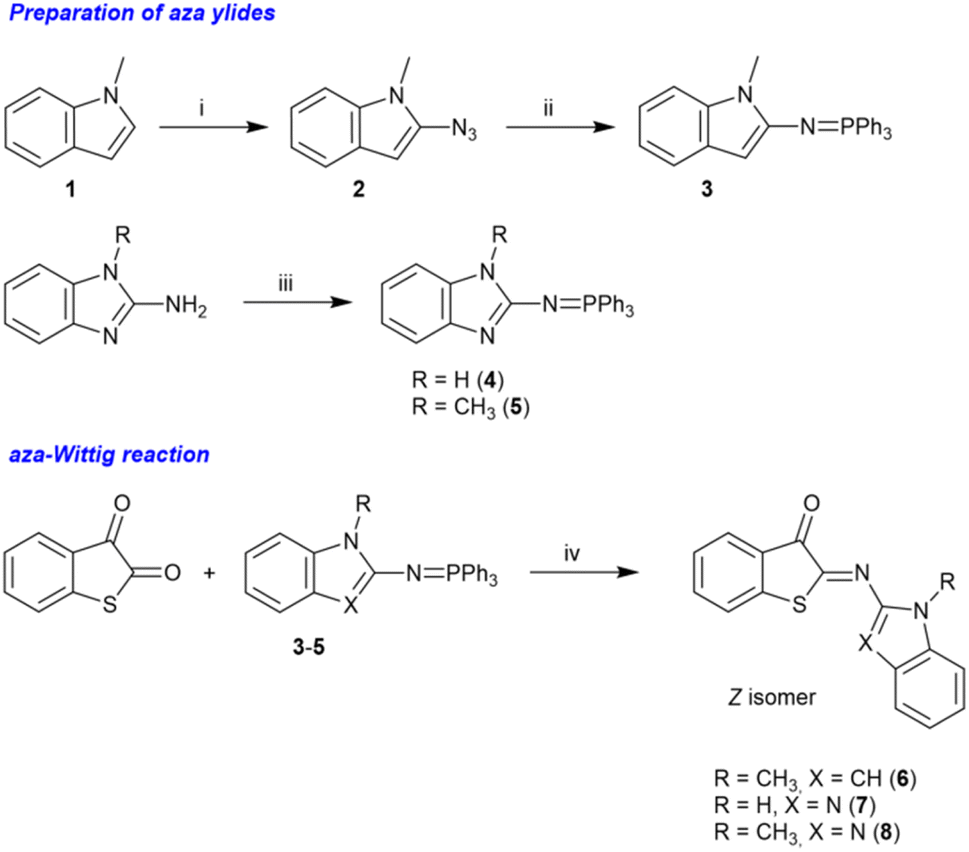 | | Scheme 1 Synthesis of HA-ITI photoswitches 6–8. Reagents and reaction conditions: (i) TsN3, n-BuLi, Et2O, reflux, 70% yield; (ii) PPh3, Et2O, 0 °C, 30% yield; (iii) Ph3PBr2, toluene, Et3N, reflux, 72–80% yield; (iv) toluene, 90 °C, overnight, 15–65% yield. | |