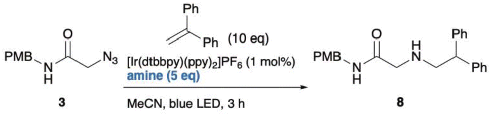 Finally, the newly discovered reaction was validated using small-molecule analogues. Similar to the PNA-templated reaction between Y3 and X12, a photo-triggered reaction between azides and acrylamides was examined. Initially, an excess amount of photoredox catalyst (3.3 or 15 equiv.) and high dilution (75–300 µM), as used during the screen, was required to establish suitable conditions for small-molecule reactions. However, under these conditions, only trace amounts of the ligated product were obtained, with amines from azides as the main products (Scheme S2). This outcome indicated that changing from PNA-templated reactions to non-templated reaction caused the loss of proximity effect and the optimized microenvironment. To identify better partners for the activated azides, we rescreened several alkenes and found that 1,1-diphenylethylene reacted effectively with azide 3 under optimized photoredox conditions (Scheme S3, and Table 1). We also examined various reducing agents, as water solubility (important for PNA reactions) was unnecessary in this context. Among those tested, N-methyl morpholine (NMM) gave the highest yield (61%) of ligated product 8 in MeCN (entry 8). In contrast, i-PrNEt2, Et3N, and TMEDA primarily produced reduced product 4 (entries 2–4), while quinuclidine led to incomplete conversion (entry 1). TEOA and BnNMe2 afforded moderate yields (36% and 41%; entries 6, 7). Adding water slightly decreased the yield with NMM (48%; entry 8), but TEOA gave the best yield (80%; entry 9). The optimized conditions exhibit several advantages: applicability to alkyl azides, short reaction time, and tolerance to dilution. The main limitation is the need for excess 1,1-diphenylethylene. Considering the effectiveness of TEOA, we compared the pKBH values of the amine reductants. TEOA and NMM, both having relatively low pKBH (<8), correlated with higher yields of ligated product.