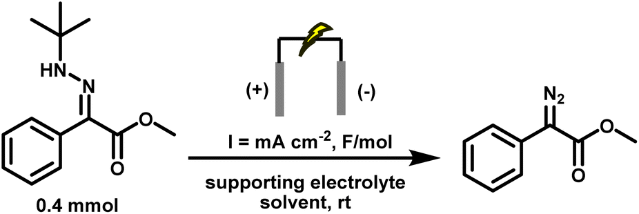 Electrochemical strategies have recently emerged as a promising alternative for the generation of diazo compounds44,45 and cyclopropanes.46,47 By replacing stoichiometric oxidants with electricity, anodic oxidation of hydrazones offers a direct, atom-economical route under mild, oxidant-free conditions.48–50 This not only reduces chemical waste but also allows fine control over redox potentials and reaction parameters, improving both selectivity and safety.51–54 Initial studies demonstrated the feasibility of generating diazo species electrochemically, but these reports were typically limited to one or two model substrates and often required isolation of the diazo intermediates before further use.55–57 More recently, our group, in collaboration with the Ollevier laboratory, reported a greener electrochemical method for generating stabilised diazo from simple hydrazones.44 The method proceeds under ambient conditions, tolerates air and moisture, and accommodates a range of substrates. However, even this approach remained incompatible with in situ transformations. The presence of additives such as potassium iodide and ammonium acetate, and the use of acetonitrile as solvent, led to side reactions that precluded direct downstream reactivity. In particular, these conditions were incompatible with carbene transfer, meaning that the diazo compounds, though generated in a greener way, still had to be isolated and purified. Thus, the intrinsic safety issues of diazo chemistry remained unresolved (Scheme 4).