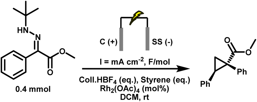 | Entry | Coll·HBF4 (eq.) | Styrene (eq.) | Rh2(OAc)4 (mol%) | Current (mA cm−2) | Charge (F mol−1) | Yield |