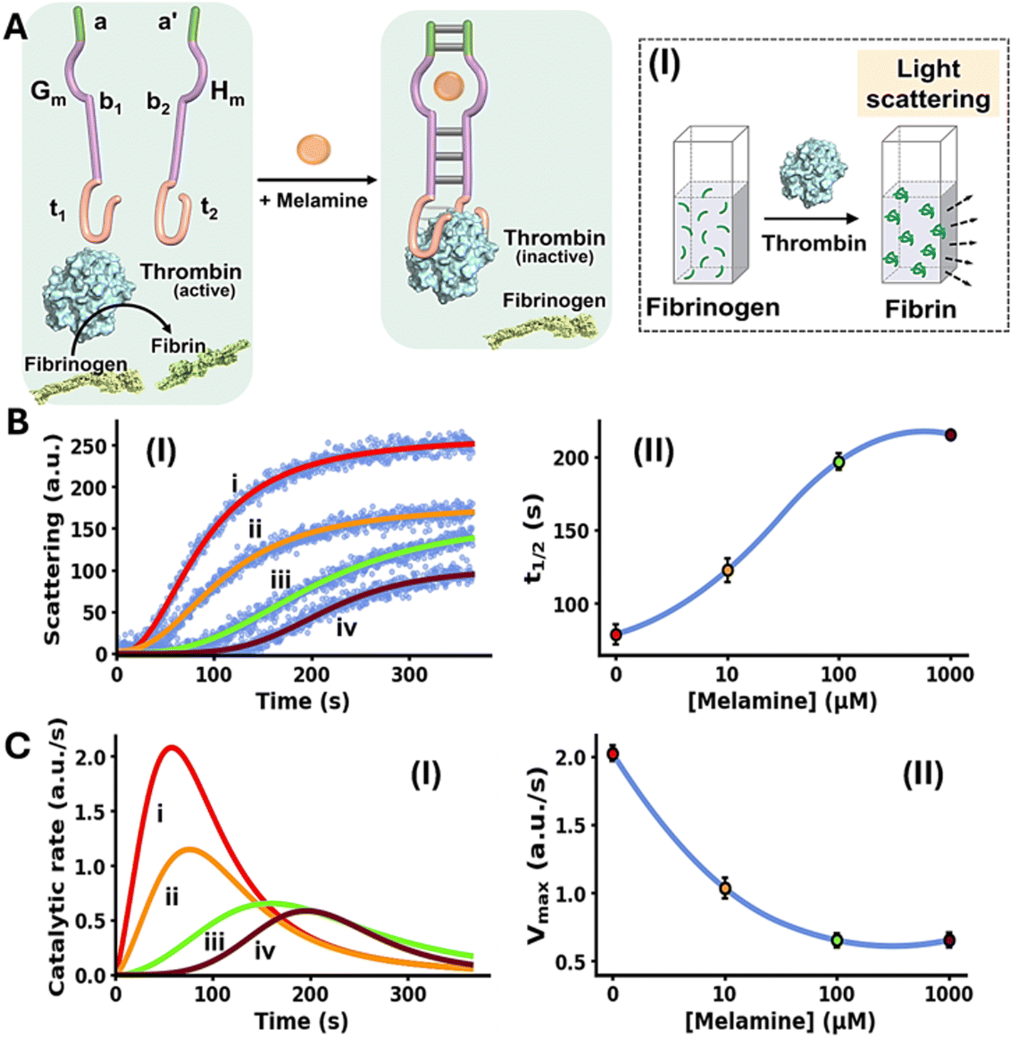 | | Fig. 2 (A) Schematic melamine (Mel)-induced allosteric inhibition of thrombin-induced fibrinogenesis (conversion of fibrinogen to fibrin) through the formation of thrombin/thrombin aptamer subunits framework. Panel I – schematic probing of the fibrinogenesis process by dynamic light-scattering. (B) Panel I – temporal light-scattering curves upon inhibition of thrombin-induced fibrinogenesis in the presence of the thrombin/Mel aptamer subunits framework Gm/Hm and variable concentrations of Mel: (i) 0 µM, (ii) 10 µM, (iii) 100 µM, (iv) 1000 µM. Panel II – t1/2 values derived from fibrinogenesis temporal light-scattering curves, in the presence of variable concentrations of Mel. (C) Panel I – temporal catalytic rates of thrombin-induced fibrinogenesis in the presence of Gm/Hm strands, allosterically stabilized by variable concentrations of Mel: (i) 0 µM, (ii) 10 µM, (iii) 100 µM, (iv) 1000 µM. Panel II – maximum fibrinogenesis rates (Vmax) upon subjecting Gm/Hm to variable concentrations of Mel. In all experiments, Gm/Hm = 1.0 µM, thrombin = 5 nM, fibrinogen = 10 mg ml−1. Data are means ±SD, N = 3. | |