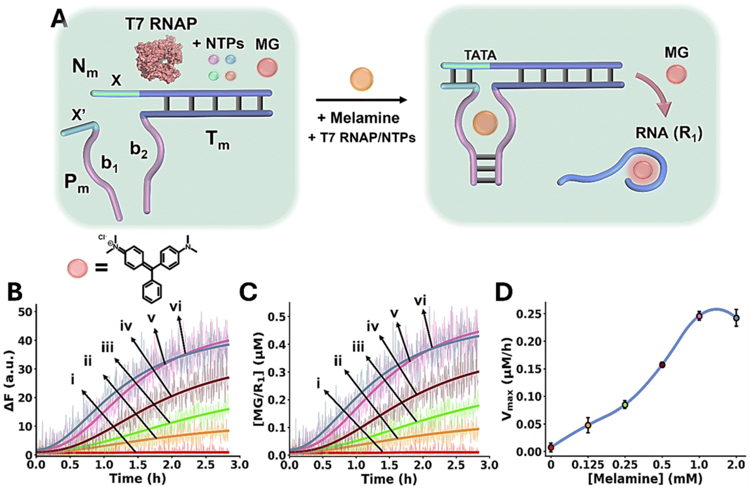 | | Fig. 3 (A) Schematic melamine (Mel)/aptamer subunits allosterically triggering of the transcription machinery transcribing the Malachite Green (MG) RNA aptamer. The fluorescent MG/aptamer complex provides the readout signal for the transcription process. (B) Time-dependent fluorescence changes of the MG/RNA aptamer transcribed product generated in the presence of variable concentrations of Mel: (i) 0 mM, (ii) 0.125 mM, (iii) 0.25 mM, (iv) 0.5 mM, (v) 1.0 mM, (vi) 2.0 mM. (C) Temporal concentration changes of the MG/RNA aptamer transcribed product generated in the presence of variable concentrations of Mel: (i) 0 mM, (ii) 0.125 mM, (iii) 0.25 mM, (iv) 0.5 mM, (v) 1.0 mM, (vi) 2.0 mM (translation of the temporal fluorescence changes shown in (B) to MG/aptamer concentrations were performed using the calibration curve provided in Fig. S5). (D) Maximum catalytic rates (Vmax) corresponding to the formation of the transcribed MG/aptamer product, in the presence of variable Mel concentrations. In all experiments, Nm/Tm = 0.2 µM, Pm = 0.2 µM, NTPs = 0.5 mM, T7 RNAP = 1.5 U µl−1. Data are means ±SD, N = 3. | |