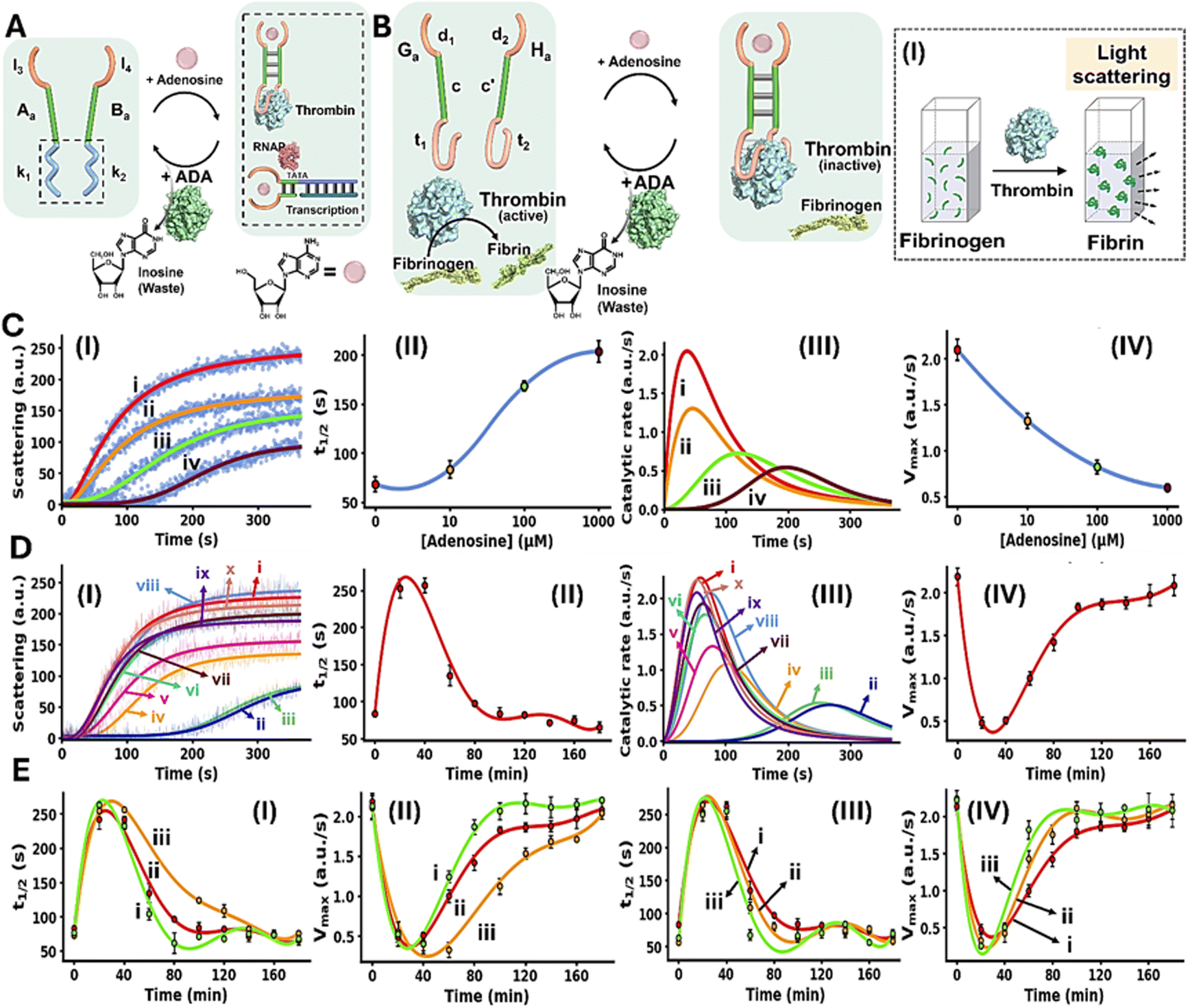 Fig. 4B depicts schematically the reaction circuit used for the allosteric transient inhibition of the thrombin-induced coagulation of fibrinogen to fibrin in the presence of Ade and ADA. The system consists of two strands Ga and Ha as the DNA functional framework and ADA as the auxiliary catalyst. The strands Ga and Ha include the Ade aptamer subunits d1 and d2 conjugated to the complementary sequences c and c′ and extended by the anti-thrombin aptamer subunits t1 and t2. While in the absence of Ade, the base complementarity of c and c′ is insufficient to form a stable Ga/Ha duplex structure that binds to thrombin and inhibits the thrombin-induced fibrinogenesis. The addition of Ade leads to the formation of the Ade/aptamer subunits complex, cooperatively stabilized by the c/c′ duplex, leading to the assembly of the supramolecular Ga/Ha complex that stabilizes the thrombin aptamer subunits allowing the association of the interstrand Ade/Ga/Ha supramolecular thrombin aptamer subunits framework to thrombin. Binding of the interstrand Ade/Ga/Ha to thrombin allosterically inhibits thrombin-induced fibrinogenesis. The ADA coupled to the reaction circuit, concomitantly transforms Ade to inosine, leading to the separation of the Ga/Ha units from thrombin, thereby recovering the free thrombin, exhibiting non-inhibited coagulation rate. That is, the system reveals transient allosteric Ade-induced inhibition of thrombin-induced coagulation of fibrinogen to fibrin. The degree of inhibition is controlled by the concentration of Ade that regulates the allosteric formation of the Ade/aptamer subunits complex. While the ADA concentration dictates the rate of recovery of the parent module, showing non-inhibited fibrinogenesis. That is, the transient allosteric inhibition of thrombin is regulated by two parameters; the concentration of Ade that triggers the fibrinogenesis inhibition and the concentration of ADA degrading Ade thereby regulating the temporal depletion of the inhibition phenomenon. The temporal and transient allosteric inhibition of thrombin, is then, followed by the temporal light-scattering features associated with the coagulation of fibrinogen to fibrin, in the presence of variable Ade and ADA concentrations, Fig. 4B, panel I. The rate of thrombin-induced coagulation in the absence of the strands Ga/Ha, yet in the presence of Ade, show similar temporal light-scattering intensity changes to free thrombin in the absence of ligands, Fig. S4.