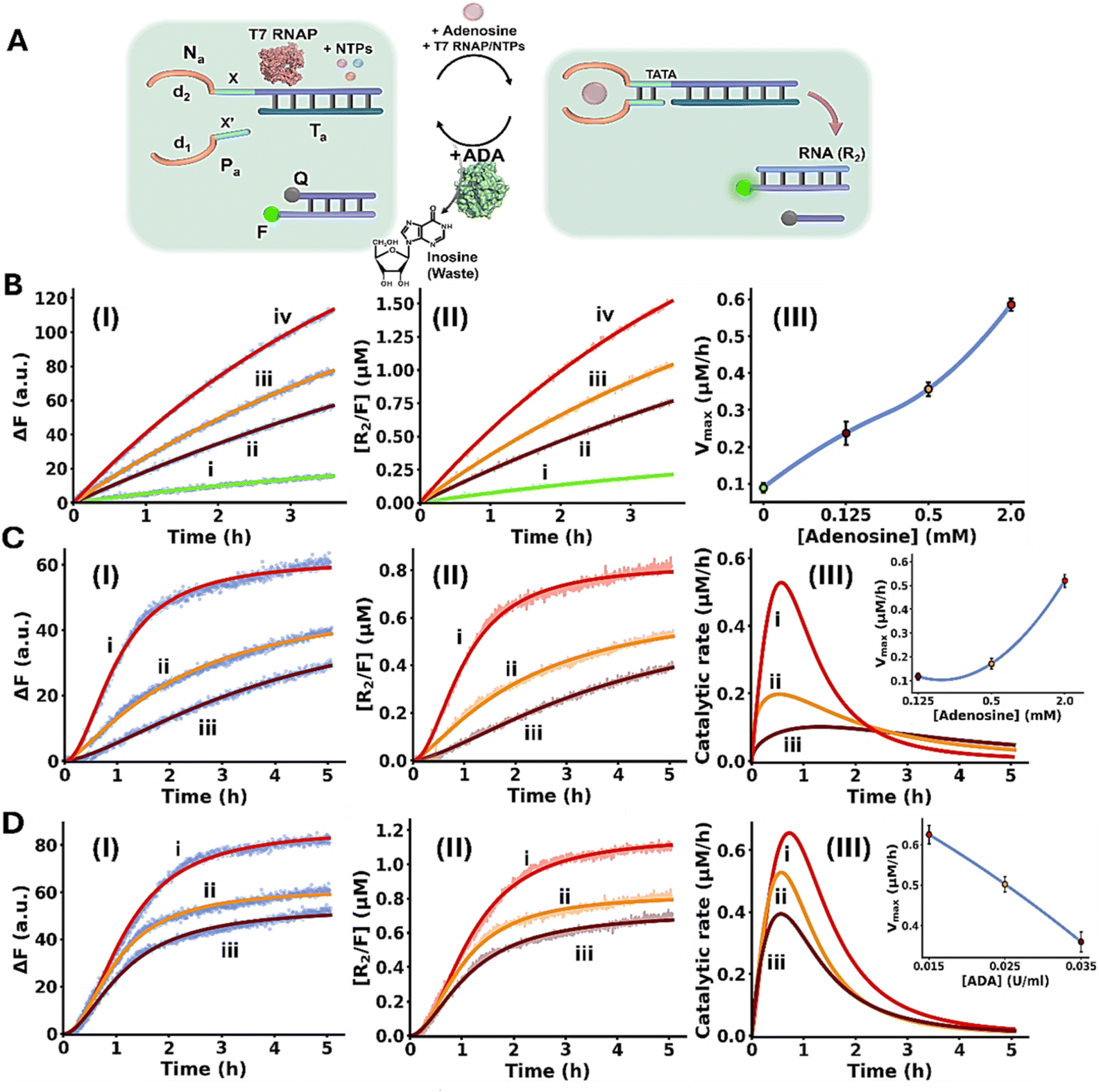 | | Fig. 5 (A) Panel I – schematic reaction module applying the adenosine (Ade)/adenosine deaminase (ADA) system for the transient allosteric operation of a transcription machinery emulating temporal transcription factor regulated transcription. (B) Temporal fluorescence changes generation by the Ade-driven operation of the reaction module, in the absence of ADA, and in the presence of variable Ade concentrations: (i) 0 mM, (ii) 0.125 mM, (iii) 0.5 mM, (iv) 2.0 mM. Panel II – temporal concentration changes of R2, generated by the reaction module shown in (A), in the absence of ADA and in the presence of variable Ade concentrations: (i) 0 mM, (ii) 0.125 mM, (iii) 0.5 mM, (iv) 2.0 mM (translation of the fluorescence changes shown in panel I into R2 concentrations, using the appropriate calibration curve, Fig. S7). Panel III – temporal catalytic rates corresponding to the generation of R2 by the reaction module, under variable Ade concentrations. (C) Panel I – temporal fluorescence changes generated by the reaction module in the presence of ADA = 0.025 U ml−1 and variable concentrations of Ade: (i) 2.0 mM, (ii) 0.5 mM, (iii) 0.125 mM. Panel II – temporal concentration changes of R2 generated by the reaction module in the presence of ADA = 0.025 U ml−1 and variable Ade concentrations: (i) 2.0 mM, (ii) 0.5 mM, (iii) 0.125 mM (translation of the fluorescence changes shown in panel I into R2 concentrations, using the appropriate calibration curve, Fig. S7). Panel III – catalytic rates corresponding to the production of R2 in the presence of ADA = 0.025 U ml−1, and variable Ade concentrations: (i) 2.0 mM, (ii) 0.5 mM, (iii) 0.125 mM (first order time-dependent derivatives of the curves shown in panel II). Inset: peak rates of transient formation of R2 at different Ade concentrations. (D) Panel I – temporal fluorescence changes generated by the reaction module in the presence of Ade = 2.0 mM and variable concentration of ADA: (i) 0.015 U ml−1, (ii) 0.025 U ml−1, (iii) 0.035 U ml−1. Panel II – temporal R2 concentration changes in the presence of Ade = 2.0 mM and variable concentration of ADA: (i) 0.015 U ml−1, (ii) 0.025 U ml−1, (iii) 0.035 U ml−1 (conversion of the fluorescence changes displayed in panel I by the appropriate calibration curve, Fig. S7). Panel III – catalytic rates corresponding to the production of R2 in the presence of Ade = 2.0 mM, and variable ADA concentrations: (i) 0.015 U ml−1, (ii) 0.025 U ml−1, (iii) 0.035 U ml−1 (first order time-dependent derivatives of the curves shown in panel II). Inset: peak rates of transient formation of R2 at different Ade concentrations. In all experiments, Nm/Tm = 0.2 µM, Pm = 0.2 µM, NTPs = 3 mM, T7 RNAP = 1.2 U µl−1. Data are means ±SD, N = 3. | |