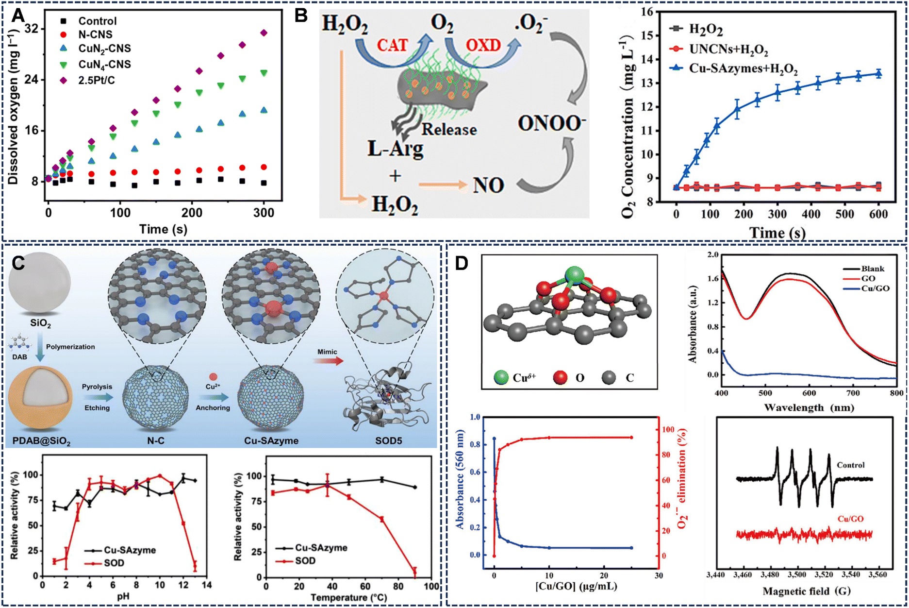SOD-like activity is a critical feature of Cu SAzymes, enabling them to catalyze the dismutation of O2˙− into H2O2 and O2, thereby intercepting ROS and mitigating oxidative damage. While POD- and CAT-like activities have been extensively studied, reports on SOD-like catalysis remain limited due to challenges in selectively converting O2˙− while maintaining catalytic stability.