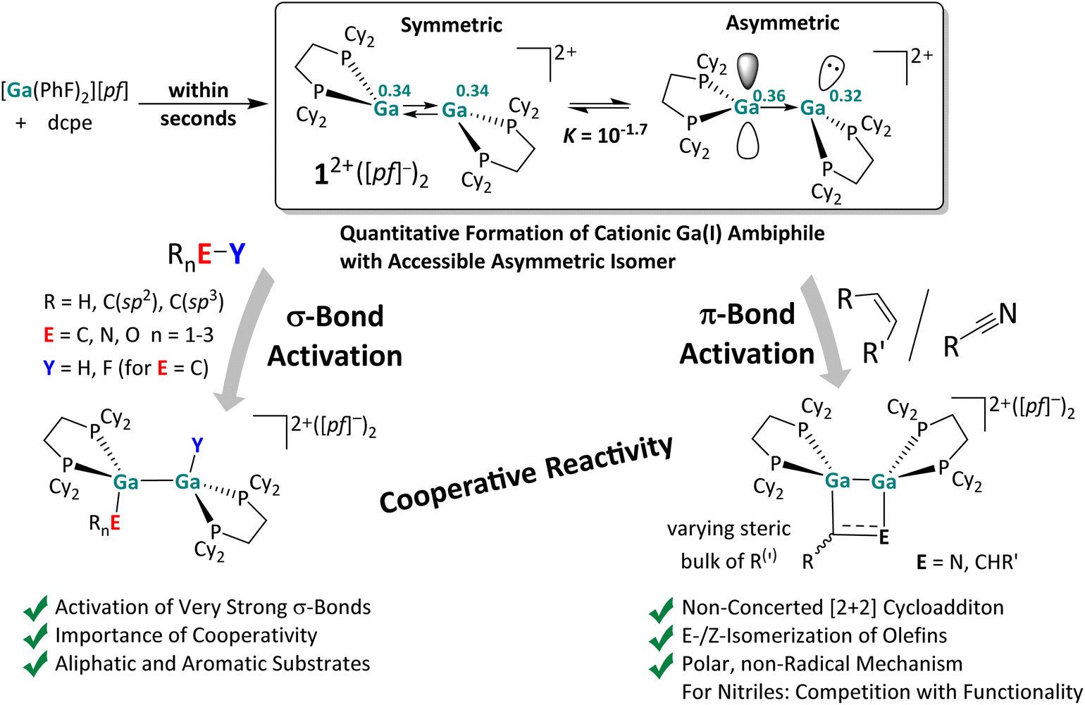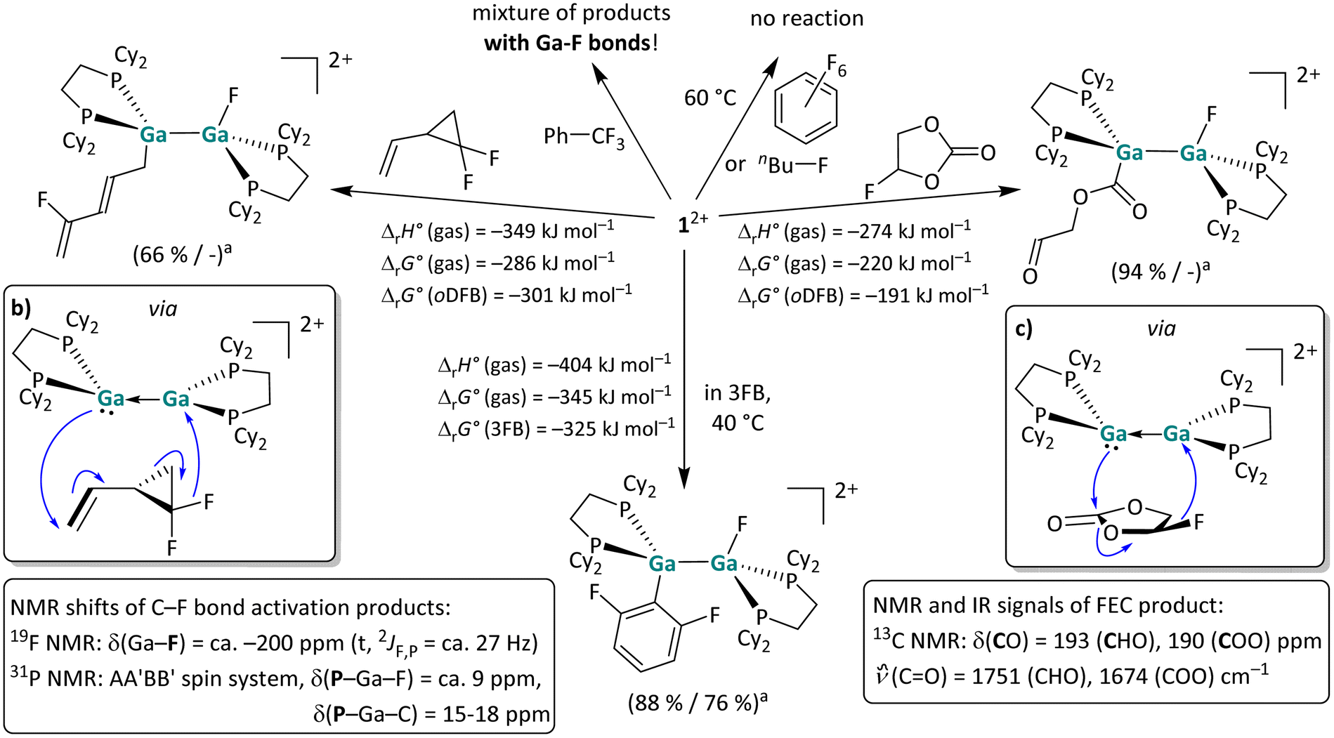 In addition, we demonstrated the bond cleavage of very strong single bonds, i.e., H–O, H–N, H–C and F–C bonds with [{Ga(dcpe)}2]2+, under mild conditions. The H–O and H–N bonds are even cleaved under ambient conditions. These results underline the pronounced reactivity of dicationic digallenes – probably proceeding through an accessible asymmetric conformer, which was shown to be only 10 kJ mol−1 higher in energy than the ground state using DFT calculations. The electronic influence of substrate/digallene adduct formation is clearly visible from the QTAIM and EDA-NOCV analyses, revealing asymmetric charge redistribution facilitating the bond activation. Quantum chemical calculations indicate that the H–N, H–O and C–F bonds are likely cleaved in a concerted, cooperative mechanism, promoted by substrate coordination. The oxidative addition into the H–C bond of acetonitrile probably also proceeds via initial coordination of MeCN and a series of protonation/deprotonation steps. It appears that coordination of the substrate to the Ga⇄Ga double bond is a prerequisite for activation of strong bonds, as similar observations were made with fluorinated organic compounds: while [{Ga(dcpe)}2]2+ cleaves the C–F bonds in substrates with reasonably electron rich aromatic π-systems or double bonds in a highly exergonic reaction, it does not react with very poor ligands. Notably, the facile C–F cleavage in 3FB, which is difficult to activate with neutral, subvalent group 13 species, implies that the positive charge of the digallene may induce a reactivity, which is complementary to that of the neutral congeners.