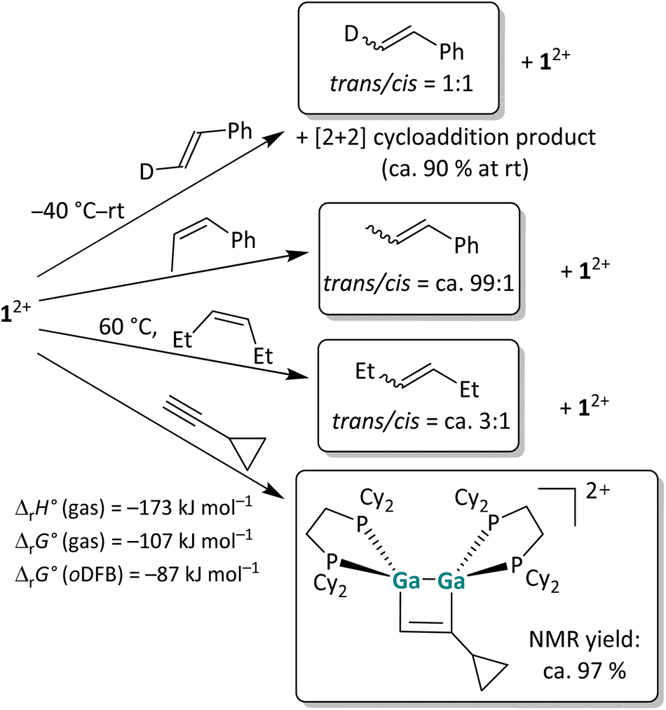To analyze the reaction mechanism of the [2 + 2] cycloaddition reaction, digallene 12+ was reacted with selected alkenes and alkynes to determine whether the reaction follows a stepwise or a concerted mechanism. Trans-deutero-styrene, cis-β-methyl-styrene, cis-3-hexene and ethinyl-cyclopropane were chosen as suitable substrates. The reaction outcomes are summarized in Scheme 2. Unless otherwise stated, the reactions were carried out at room temperature (rt) in oDFB.