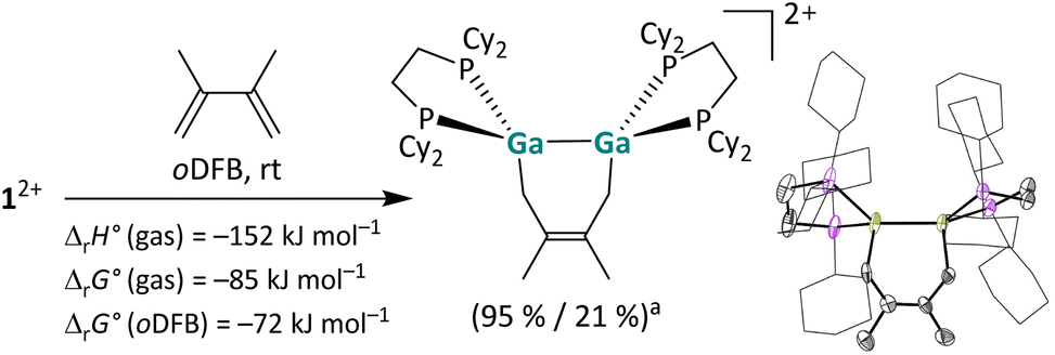 We already reported a [1 + 4] cycloaddition reaction of a 1,3-diene with a monocationic, gallene monomer.35 Furthermore, [2 + 4] cycloaddition reactions are well known for neutral digallenes,49 thus emphasizing the structural and electronic relationship of [{Ga(dcpe)}2]2+ between these substance classes.