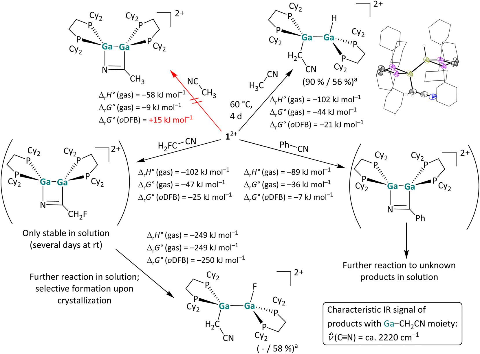 Overall, the different reactivity of 12+ towards H3C–CN and H2F–CN was unexpected. However, the different routes can be rationalized with quantum chemical calculations: as shown in Scheme 5, the hypothetical [2 + 2] cycloaddition reaction of acetonitrile with 12+ is endergonic in solution, whereas the C–H activation is exergonic, just like the [2 + 2] cycloaddition with the monofluorinated substrate (cf.Scheme 5). These results not only demonstrate that the dicationic digallene shows a versatile chemistry, but also that subtle changes in the substrate can favor different reaction pathways.