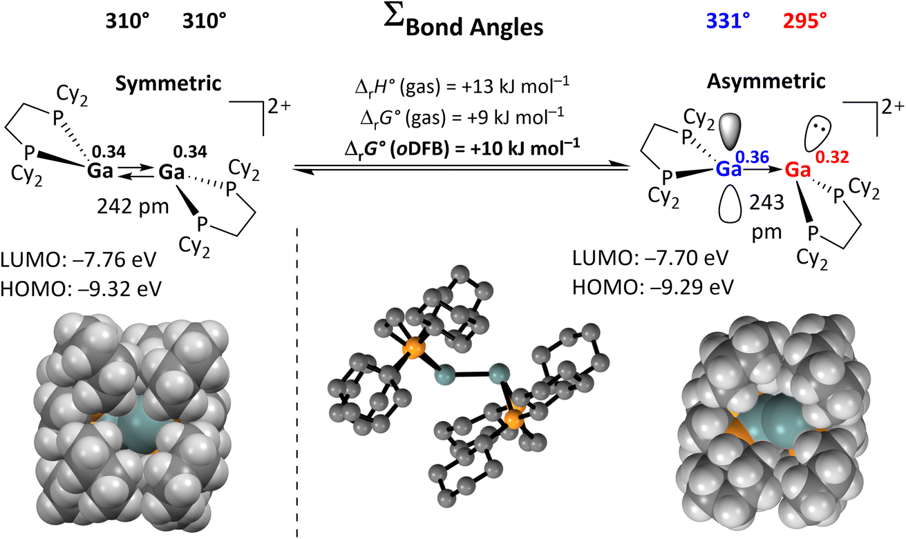 K, this implies that K = 10−1.7 at 25 °C, or that out of 50 digallenes, one is in the asymmetric conformation. Note that such a briefly mentioned asymmetric conformation for [{Ga(dipf)}2]2+ is considerably higher in energy at +45 kJ mol−1 and, hence, almost irrelevant for reactions.40 The conformational change is well reflected in the bond angles around the Ga atoms: while the sum of the bond angles increases from 310° in the symmetric conformer to 331° for the planarized Ga atom, it decreases to 295° for the pyramidalized Ga atom. The QTAIM (Quantum Theory of Atoms in Molecules) charges indicate the planarized Ga atom to have a slightly higher positive charge than in the symmetric conformer (0.36e vs. 0.34e), while the pyramidal geometry of the second Ga atom indicates the presence of an electron lone pair and thus a more negative partial charge (0.32e). However, the HOMO/LUMO positions and the Ga–Ga bond length are barely affected by this conformational change.