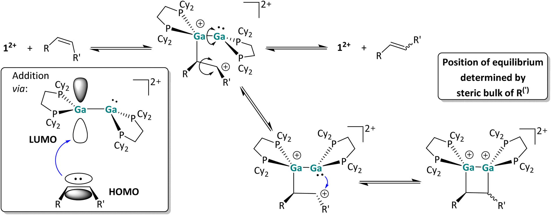 In agreement with the low-lying frontier orbitals, the digallene most likely acts as an electrophile in this reaction step, accepting electron density from the olefin and forming a carbocation following Markovnikov's rule. In the resulting carbocation intermediate, rapid rotation around the former C