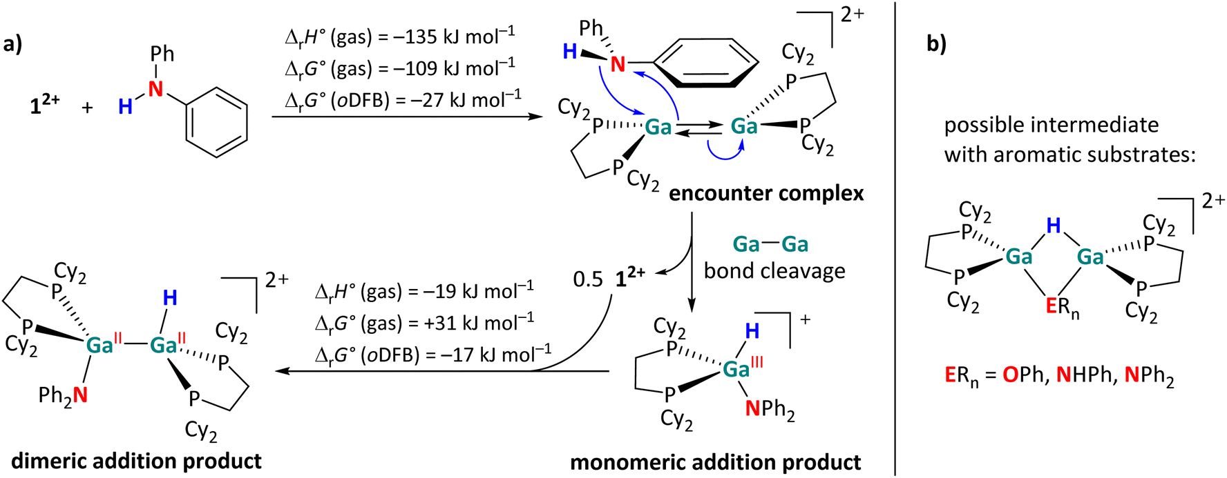Due to the close proximity of the N–H bond to only one Ga atom in the encounter complex, the –NPh2 and –H fragments are transferred to the same Ga atom, while the other Ga+ cation interacts with the π-system of the aromatic substituent and reforms 12+ after dissociation (Scheme 9a). The monomeric addition product further reacts with 12+, ultimately leading to the dimeric addition products shown in Scheme 4. Interestingly, the formation of a monomeric intermediate was not observed during the H–P activation of HPPh2.29 This is most likely due to the fact that phosphines are (towards Ga+) stronger σ-donors than amines, making the η6 coordination mode very uncommon for arylphosphines.62